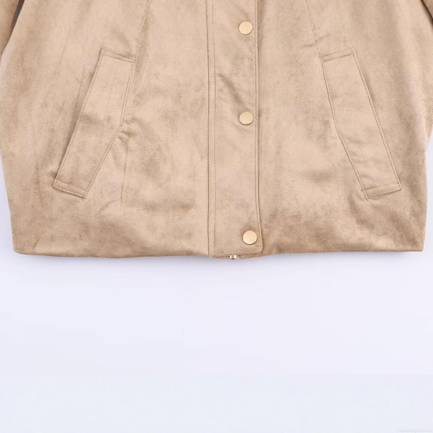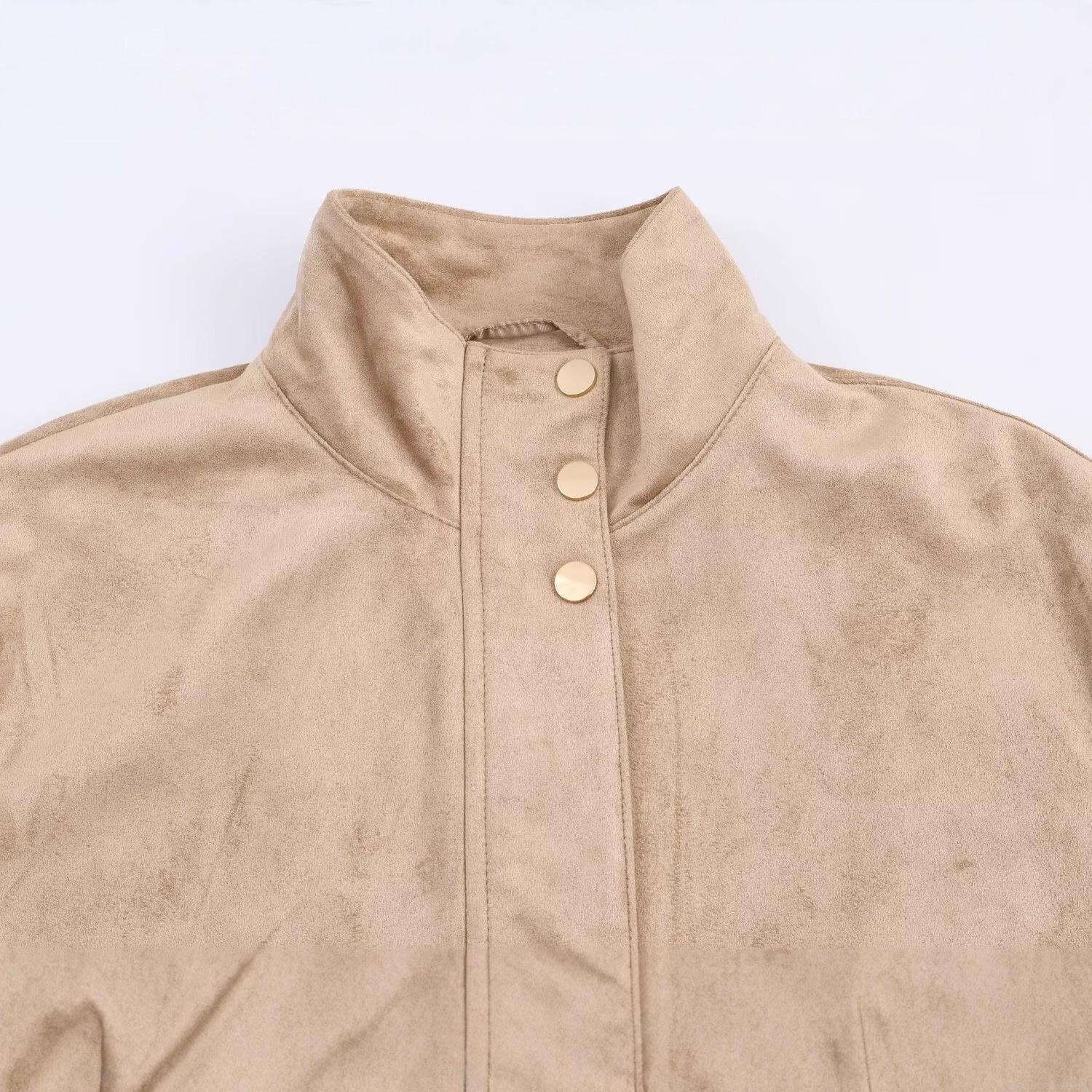 Women's Casual Faux Suede Jacket Stand-up Collar Single Breasted Khaki Coat Loose Fit Solid Color Long Sleeve Outerwear For Women