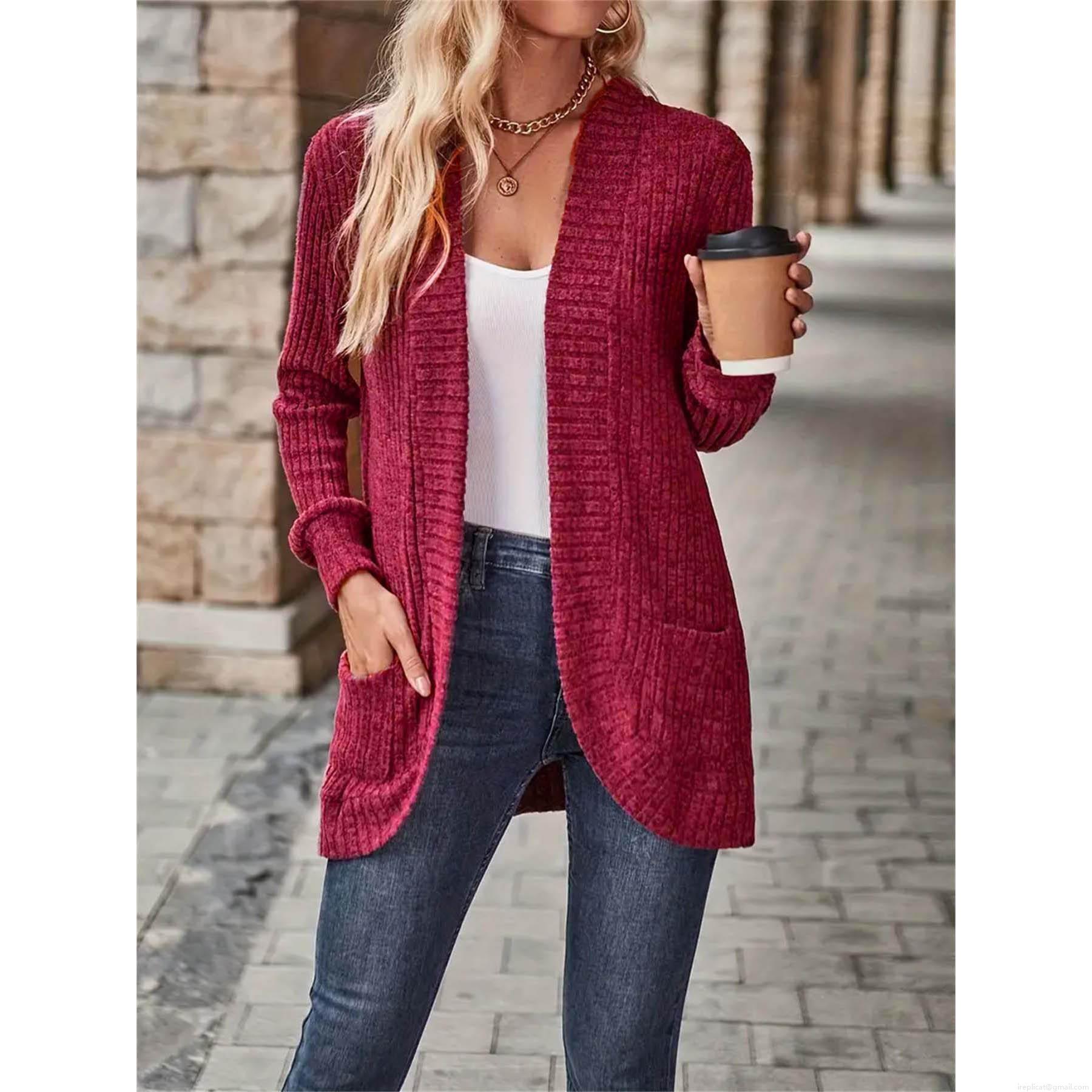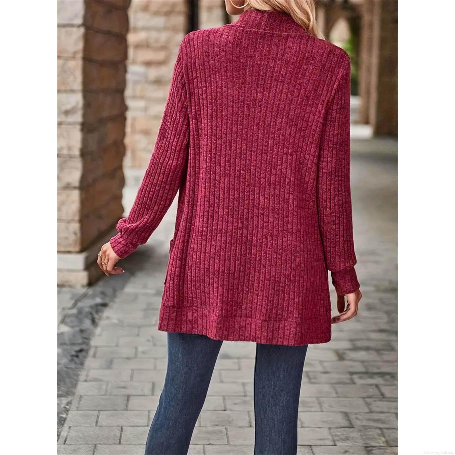 Women's Casual Knit Cardigan Open Front Long Sleeve Ribbed Sweater Jacket With Pockets Solid Color Vintage Outerwear For Fall Winter