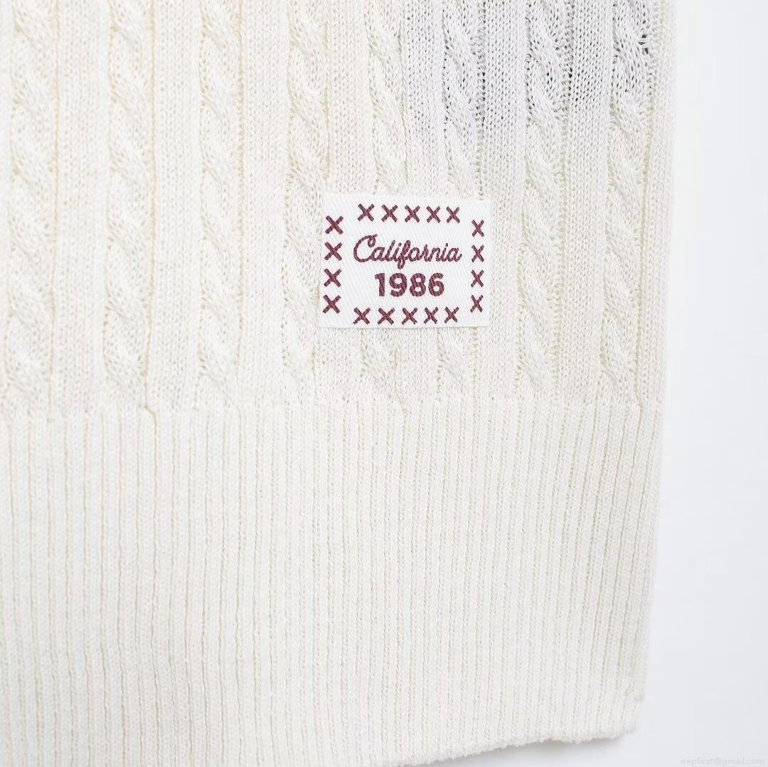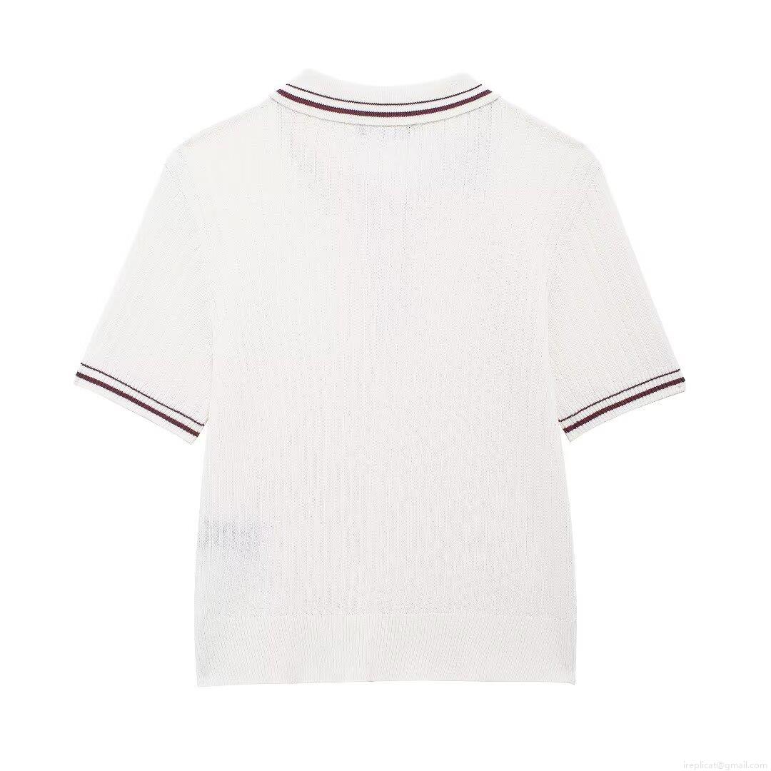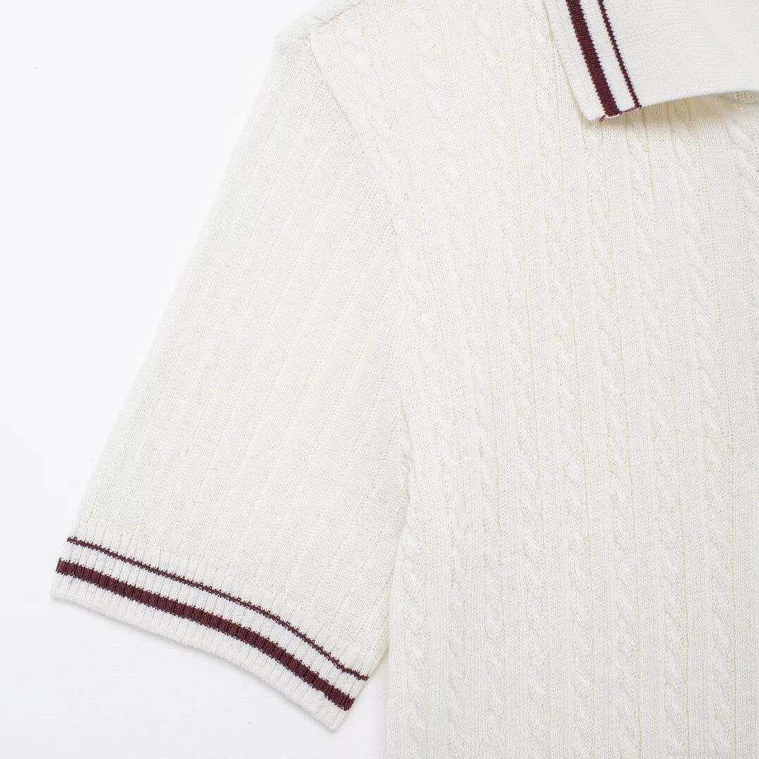 Women's Casual Knit Polo Shirt Short Sleeve Cable Knit Contrast Stripe Lapel Collar Button Up Top Academic Style Knitwear White Short Sleeve Tee