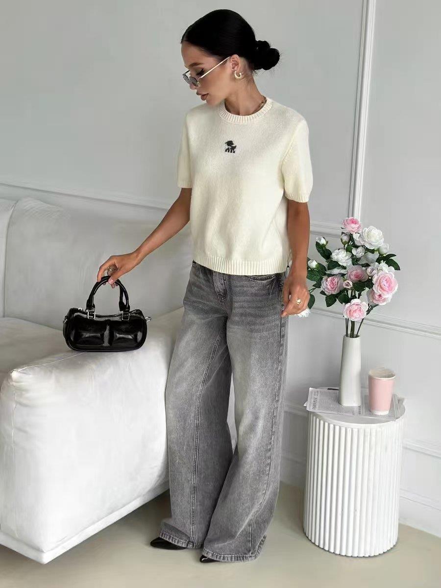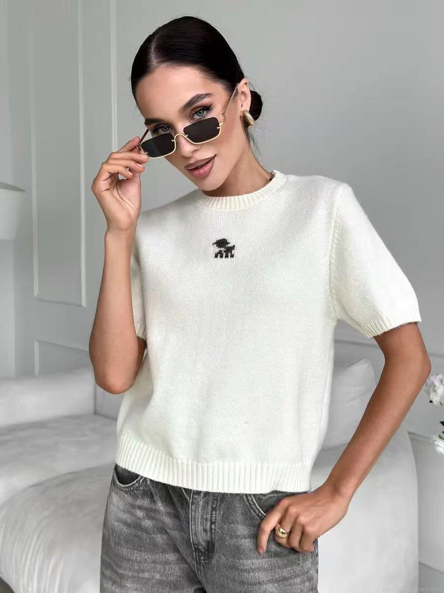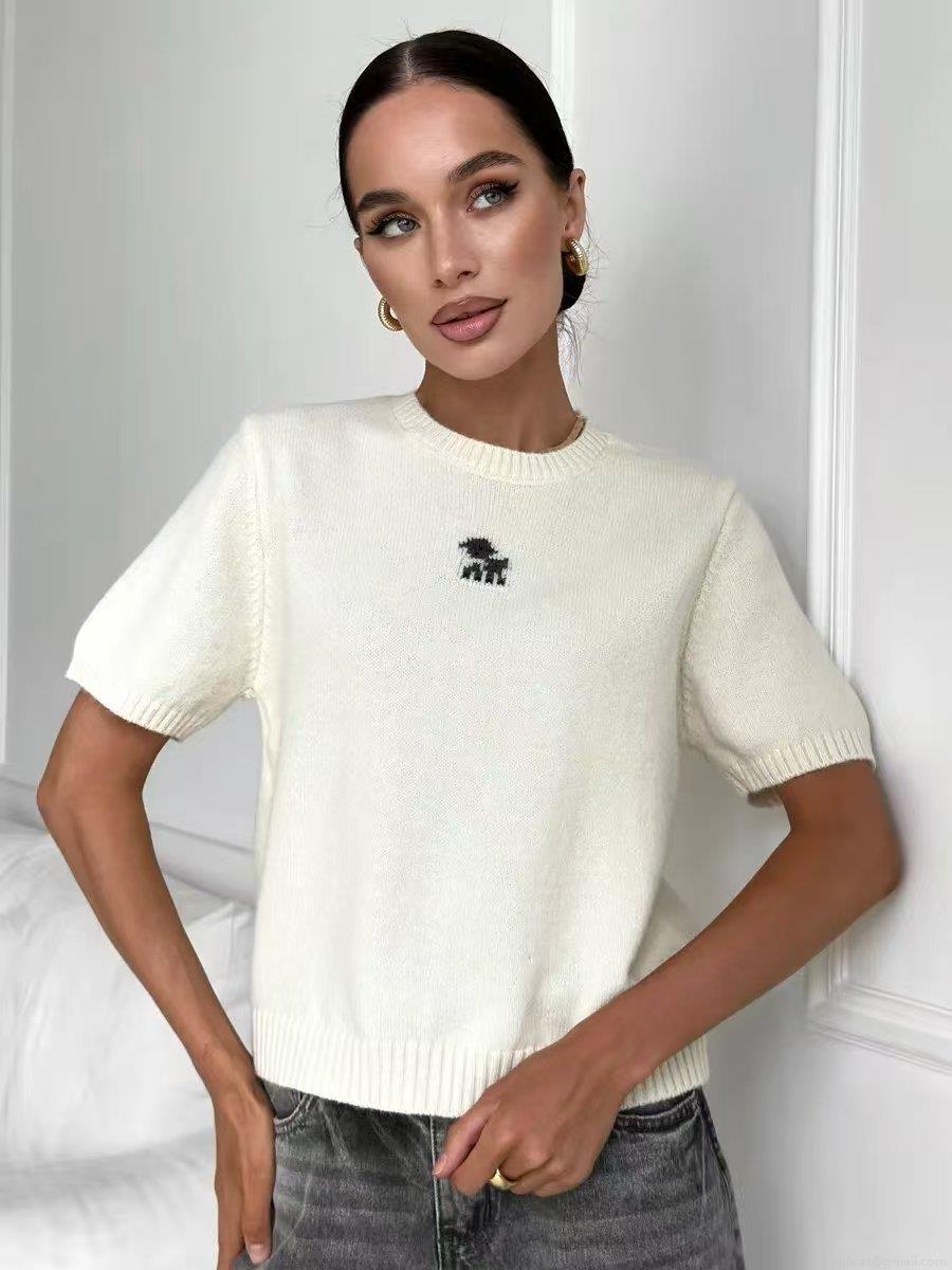 Women's Casual Knit Short Sleeve Top Round Neck Slim Fit Dog Embroidery Cotton Blend T-Shirt Summer Spring Fashion Streetwear Knitwear