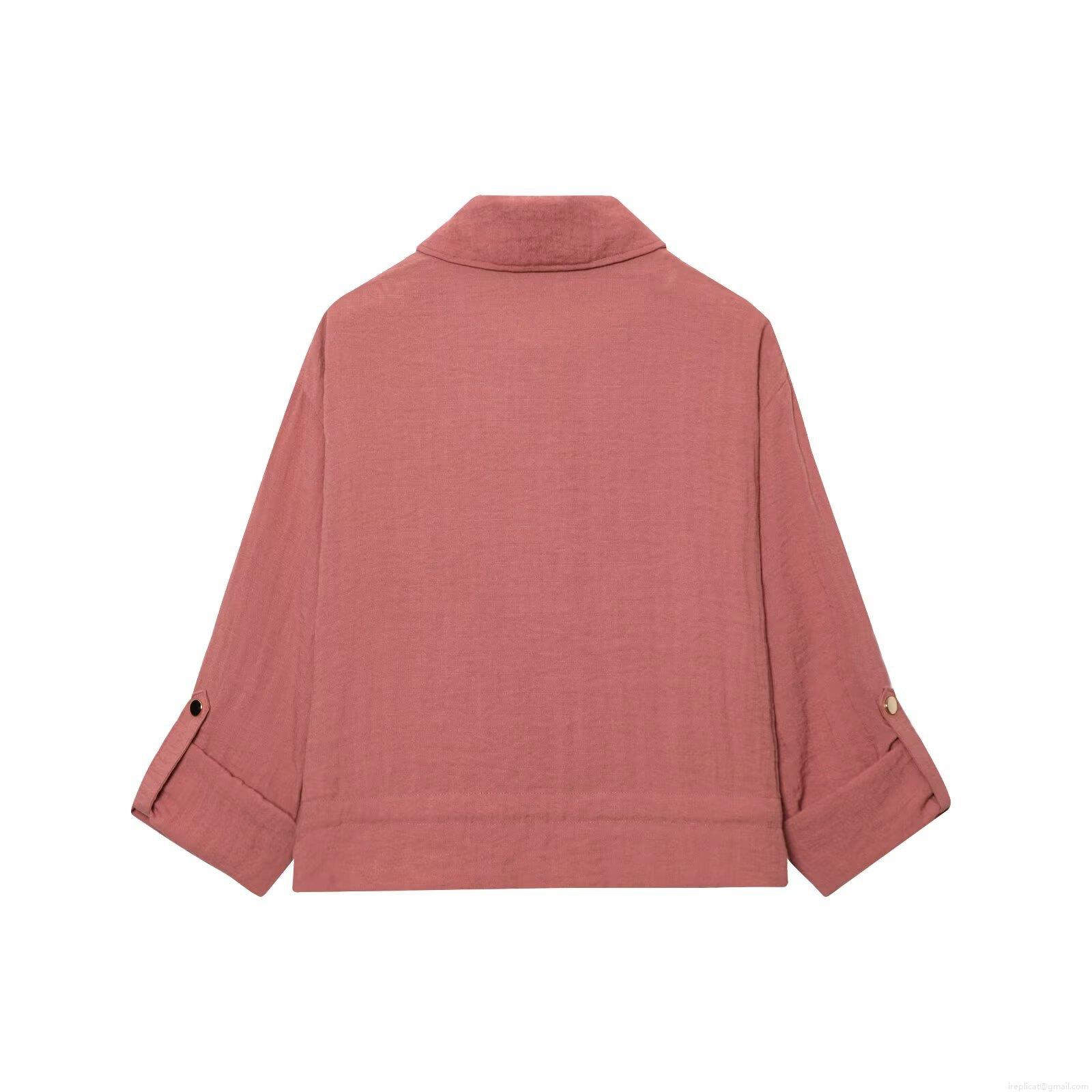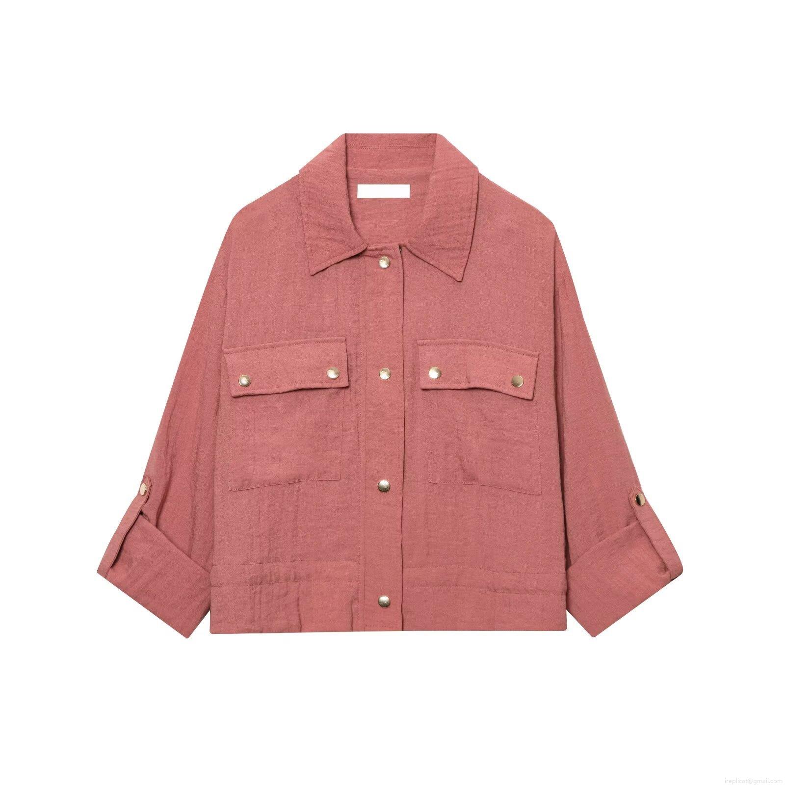 Women's Casual Lapel Collar Jacket With Dual Chest Pockets Distressed Loose Fit Long Sleeve Outerwear Solid Color Preppy Style Button Up Top Jacket