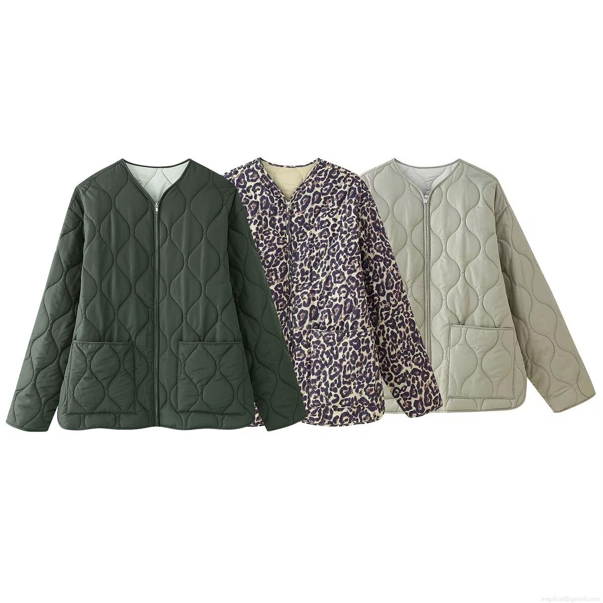 Women's Casual Leopard Print Quilted Jacket Round Neck Zipper Coat With Pockets Lightweight Warm Puffer Outerwear For Autumn Winter