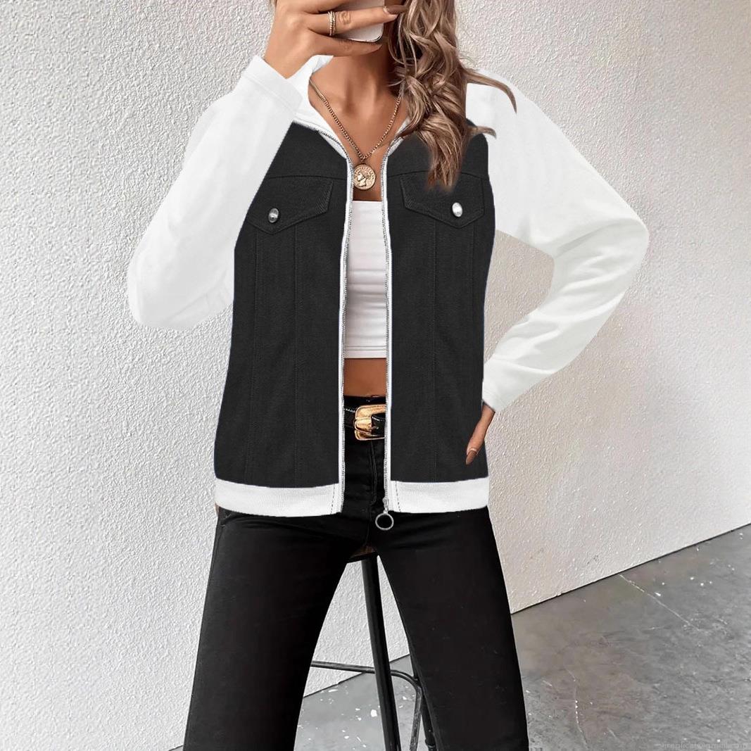 Women's Casual Patchwork Zipper Jacket Long Sleeve Color Block Outerwear With Pockets Polyester Spandex Denim Texture Stitching Coats For Autumn Winter Streetwear