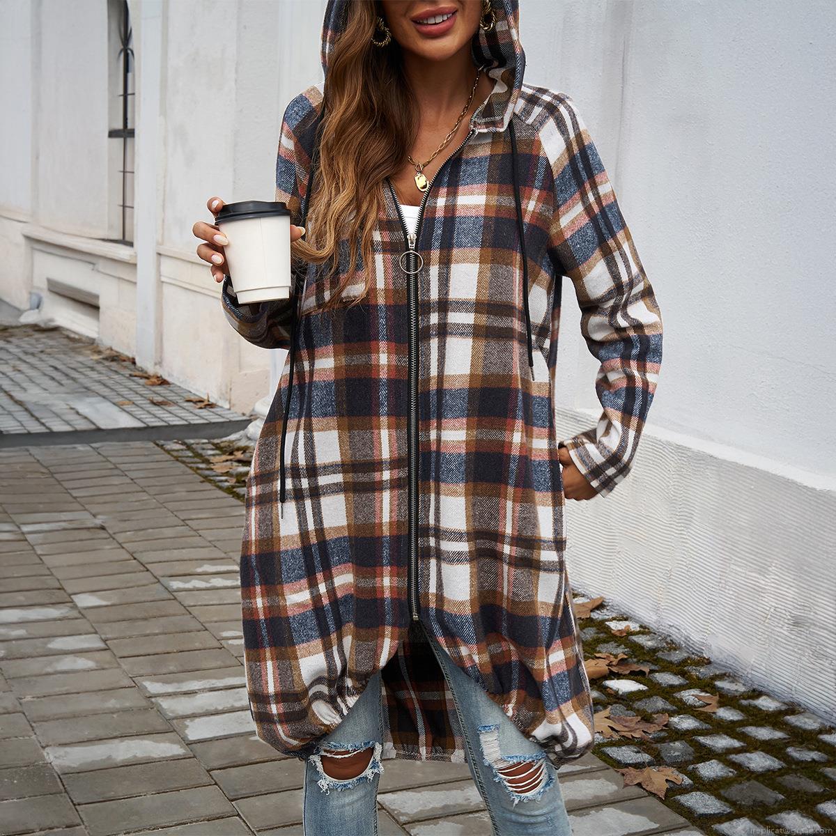 Women's Casual Plaid Hooded Long Coat Polyester Viscose Woven Zip-up Jacket Outerwear With Pockets Loose Fit Streetwear For Spring Autumn