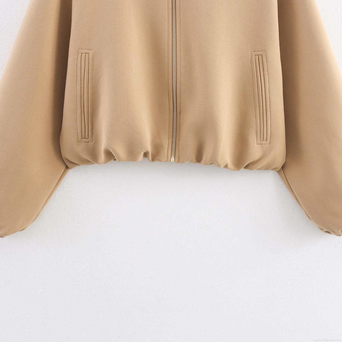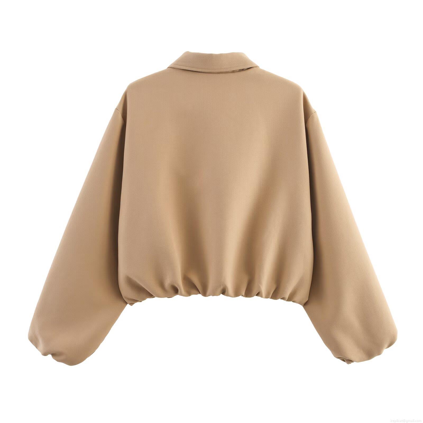 Women Pleated Lantern Sleeve Zip Up Jacket 100% Polyester Turn Down...
