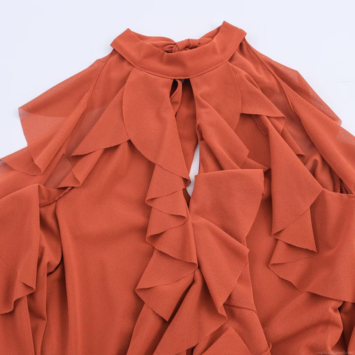 Women's Casual Polyester Long Sleeve Halter Neck Top With Ruffle Decoration Cold Shoulder Elegant Loose Fit Blouse For Daily Streetwear