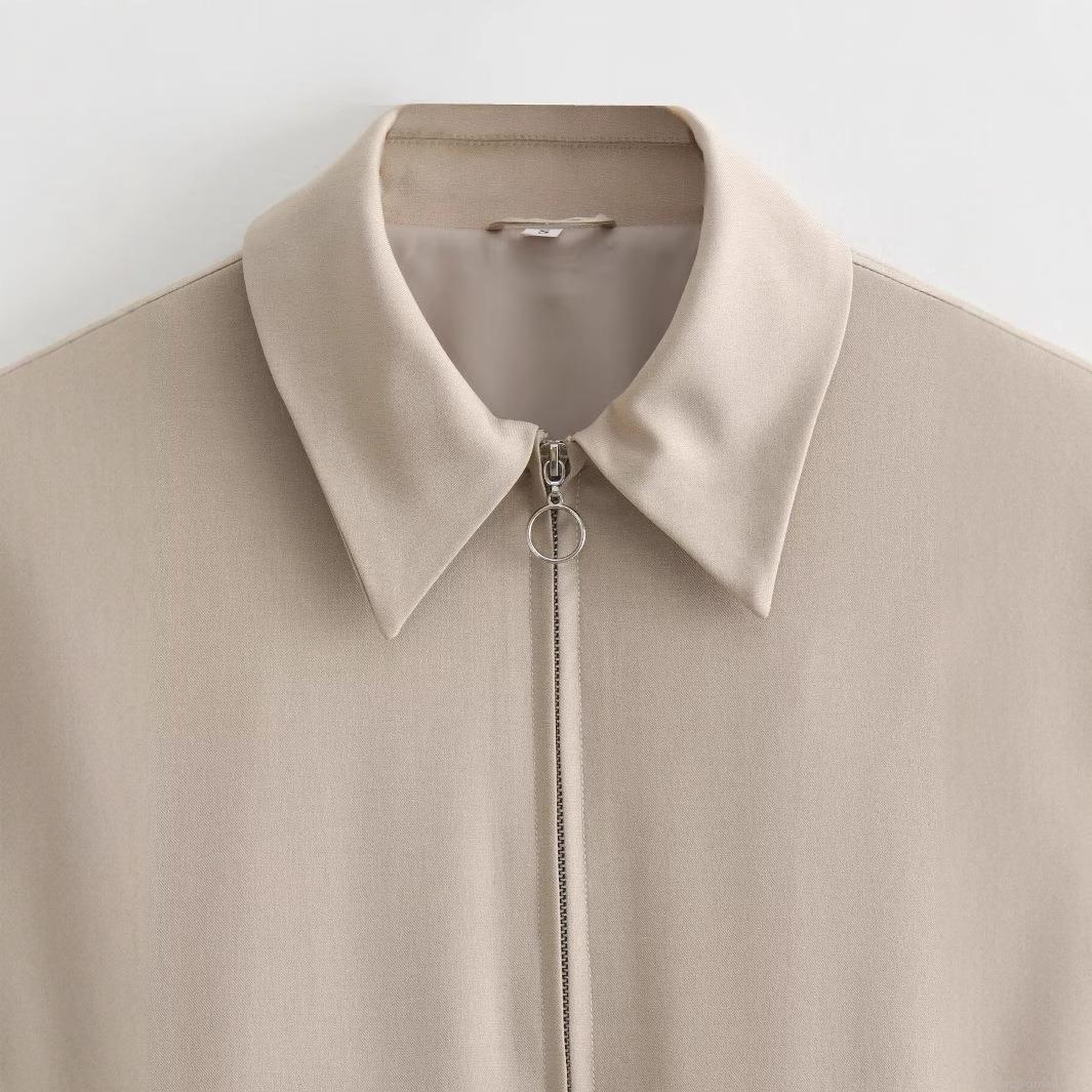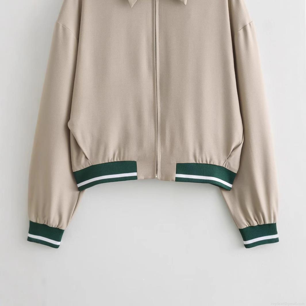 Women's Casual Polyester Woven Lapel Zipper Jacket Long Sleeve Khaki Outerwear With Striped Ribbed Cuffs And Hem Fashion Streetwear Coat For Women Adult