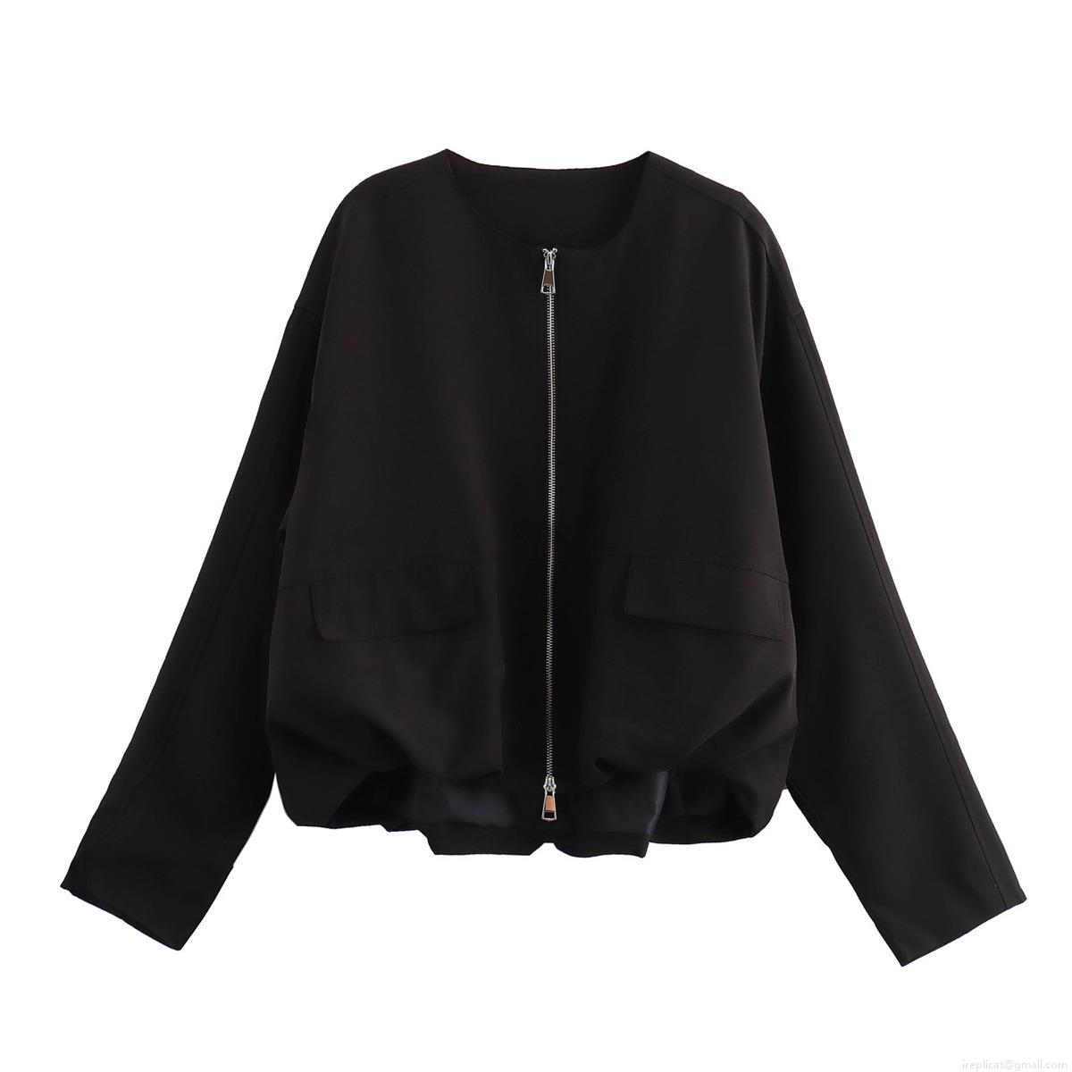 Women's Casual Polyester Zipper Crop Jacket Solid Color Round Neck Long Sleeve Coat With Pockets For Daily Wear Fashion Streetwear Outerwear