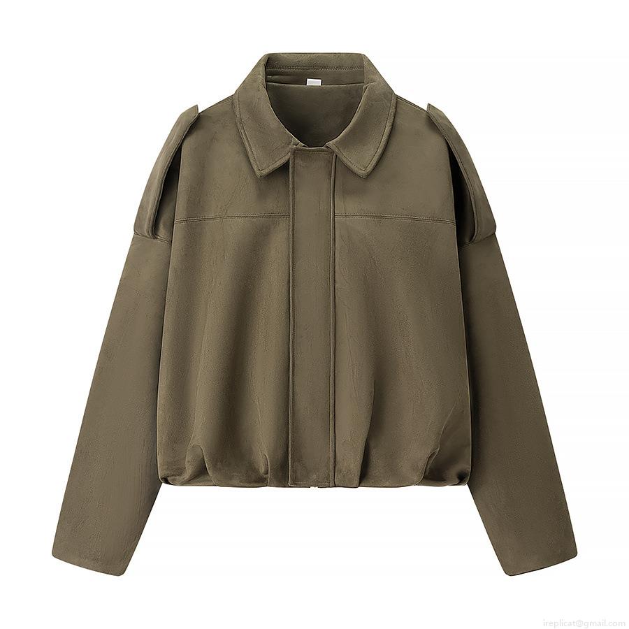 Women's Casual Short Faux Suede Jacket Solid Color Lapel Long Sleeve Zip Up Bomber Coat Vintage Streetwear Outerwear For Autumn Winter