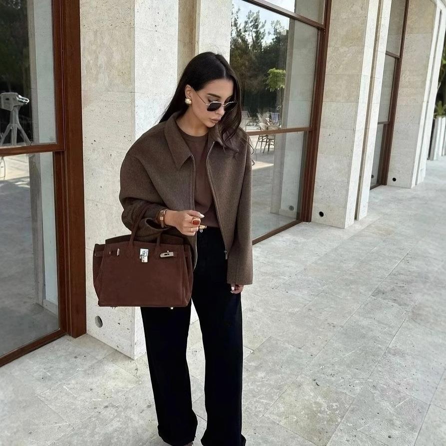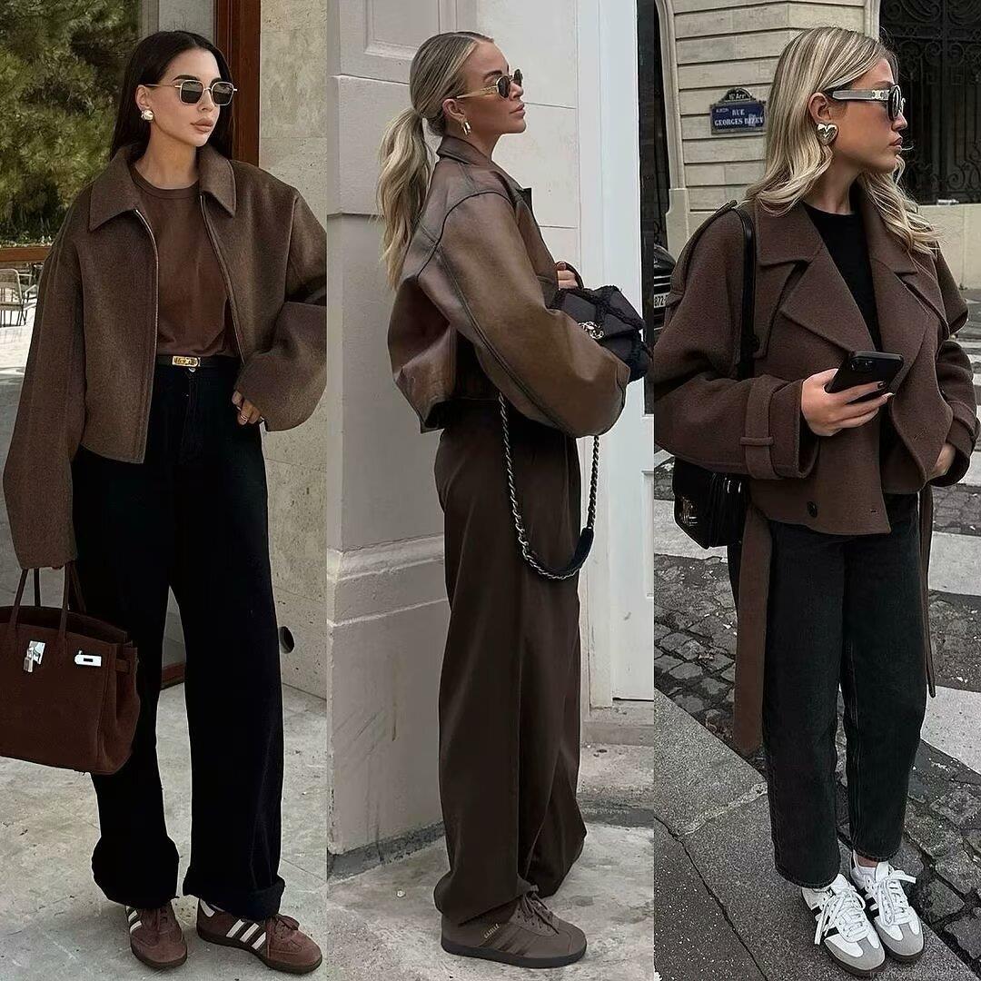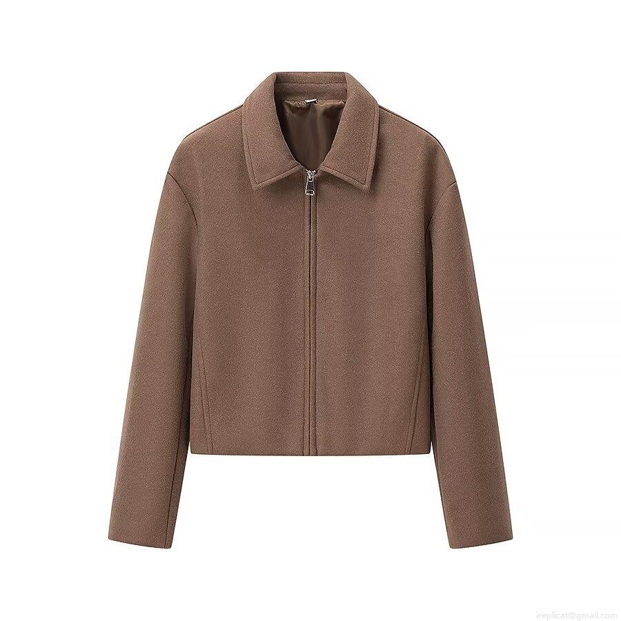 Women's Casual Short Woolen Jacket Fashion Zipper Lapel Long Sleeve Outwear For Autumn Winter Solid Color Loose Fit Coffee Coat