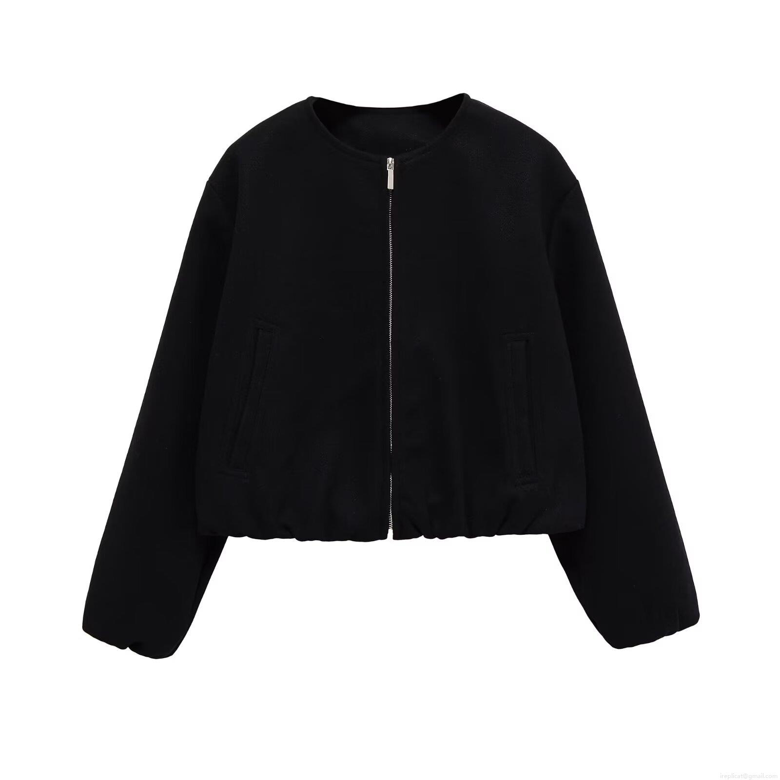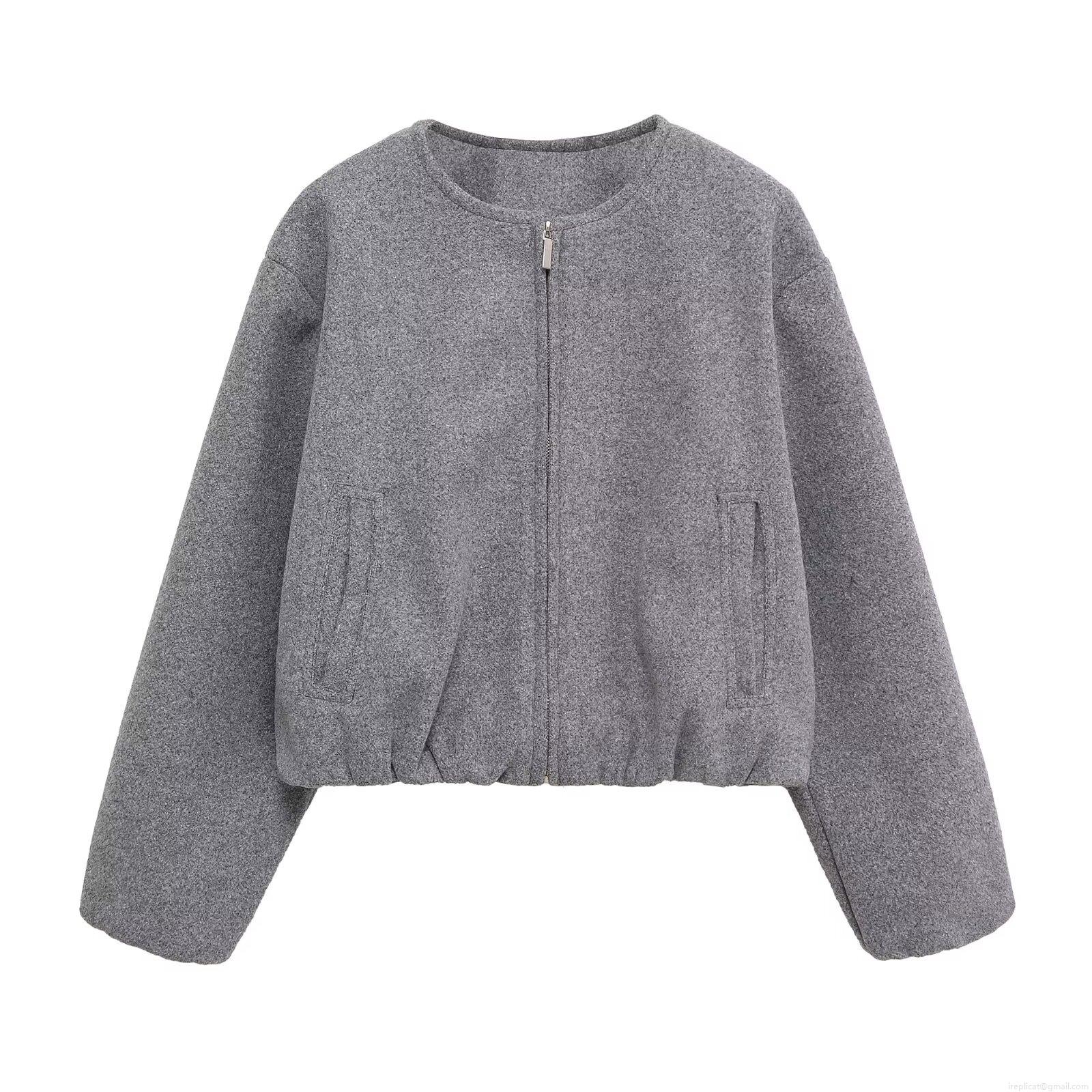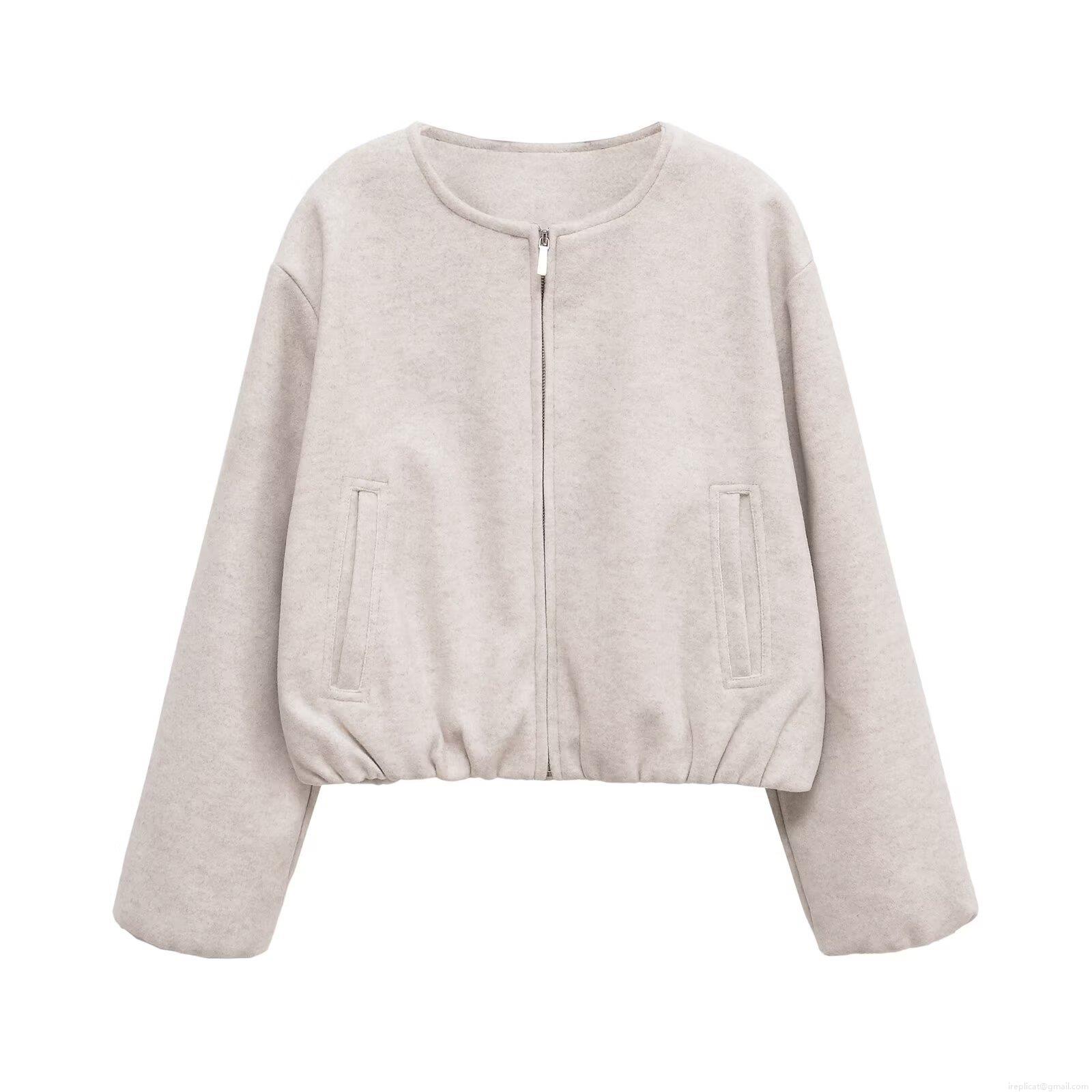 Women's Casual Short Zipper Jacket Solid Color Wool-like Polyester Round Neck Coat With Pockets For Spring Autumn Office Elegant Streetwear