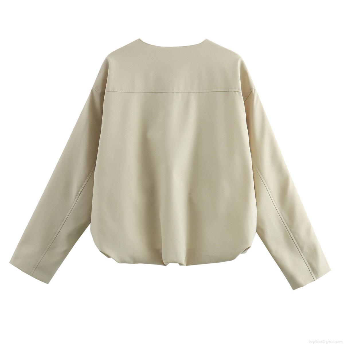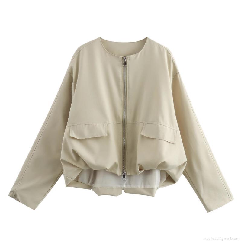 Women's Casual Solid Color Polyester Zip Up Jacket Round Neck Loose Fit Long Sleeve Coat With Pockets For Spring Autumn Streetwear