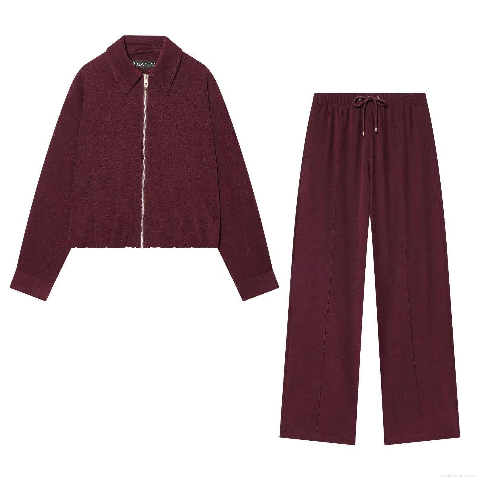 Women's Casual Solid Color Zipper Lapel Jacket Or Drawstring Elastic Waist Wide Leg Pants Streetwear Brushed Polyester Outerwear Bottoms Women's Clothing