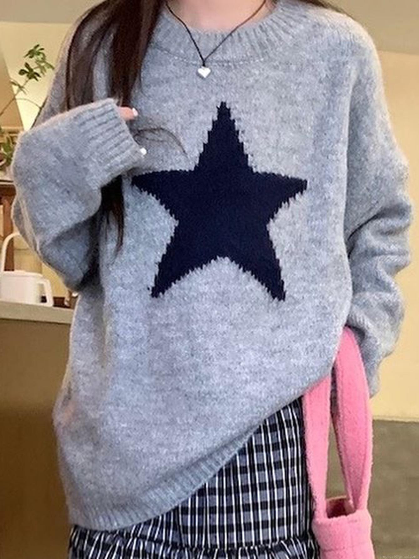 Women's Casual Star Pattern Knitted Sweater Polyester Wool Blend Crew Neck Long Sleeve Pullover Loose Fit Winter Autumn Top