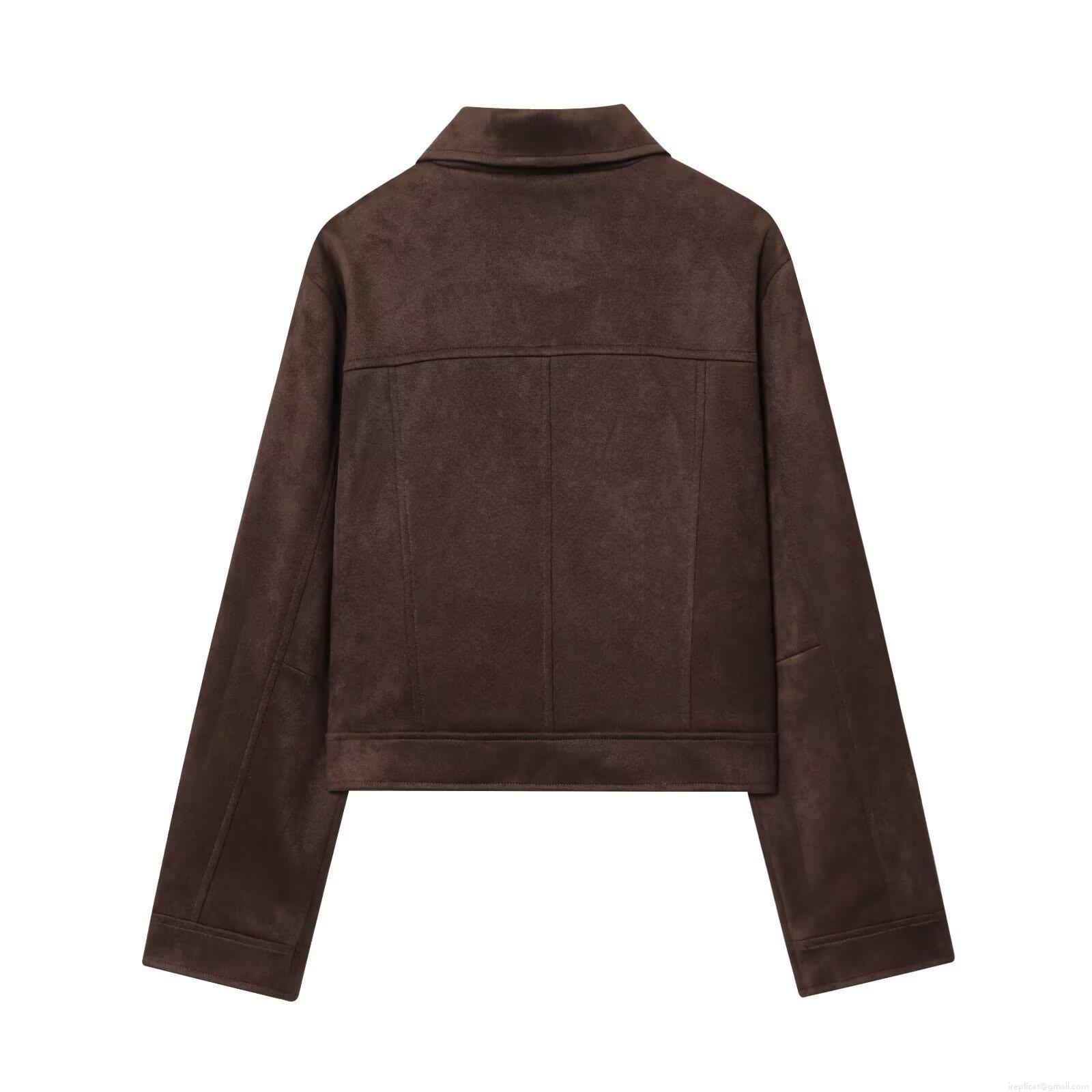 Women's Casual Suede Crop Jacket Solid Color Lapel Long Sleeve Outwear Streetwear Fashion Coffee Brown Short Coat With Pockets For Spring Autumn
