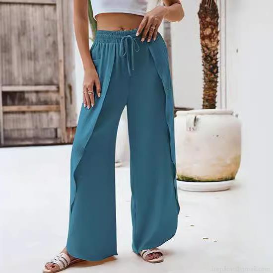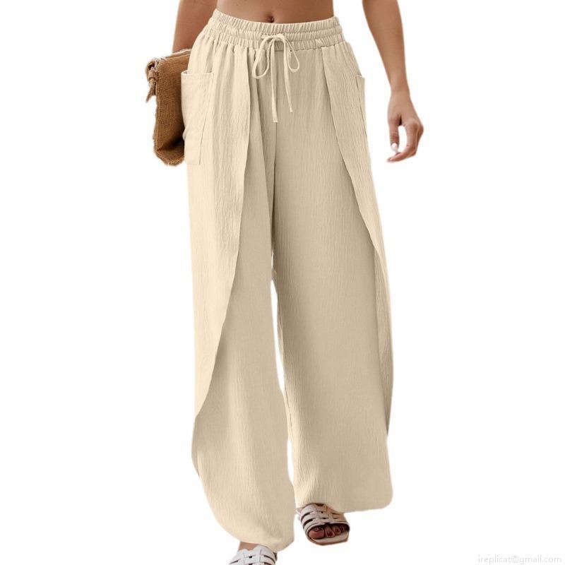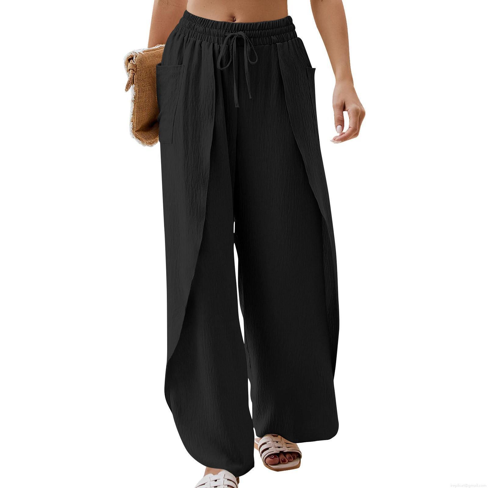 Women's Casual Wide Leg Pants High Waist Elastic Drawstring Trousers with Side Slits and Pockets Elegant Solid Color Crepe Texture Long Pants for Vacation Daily Wear