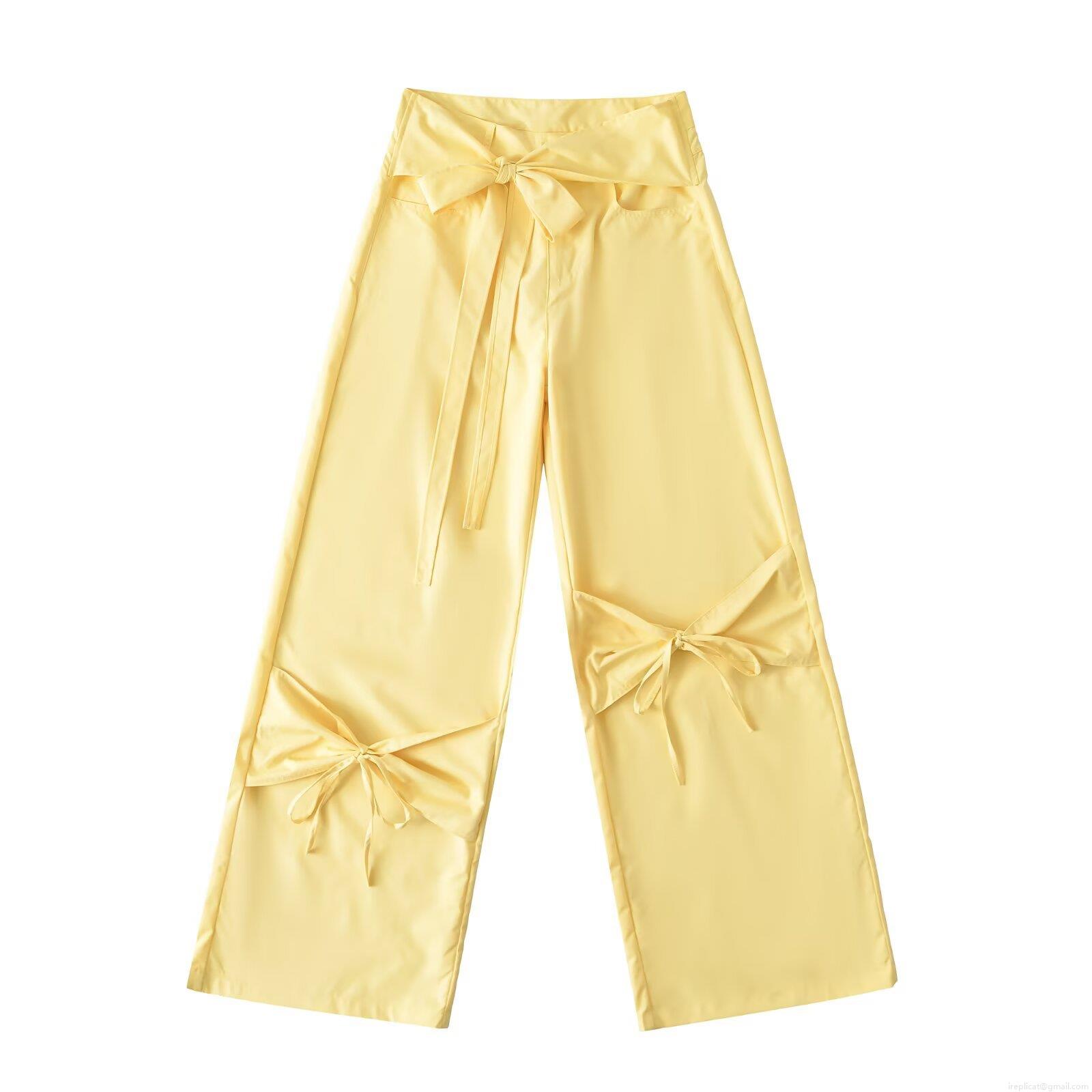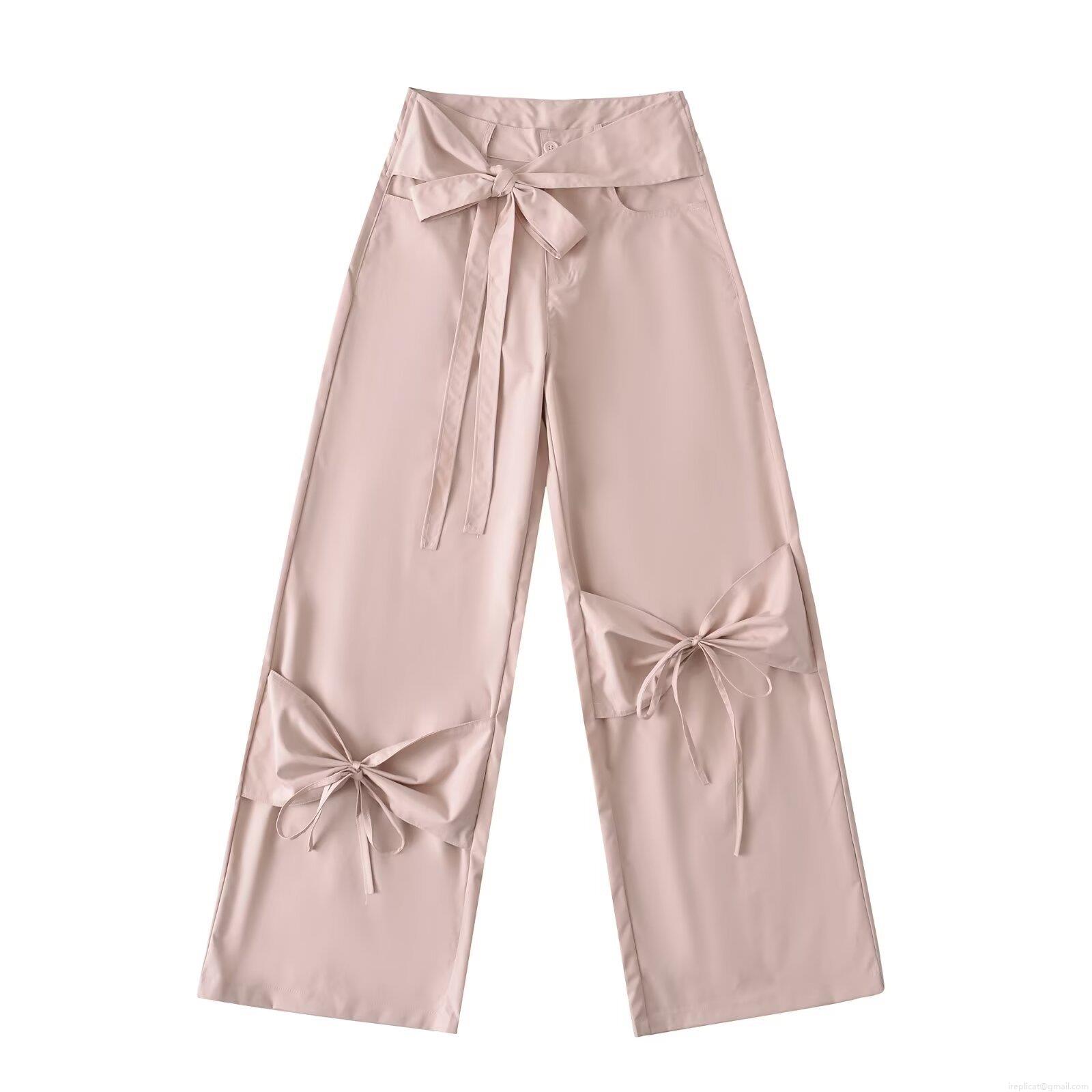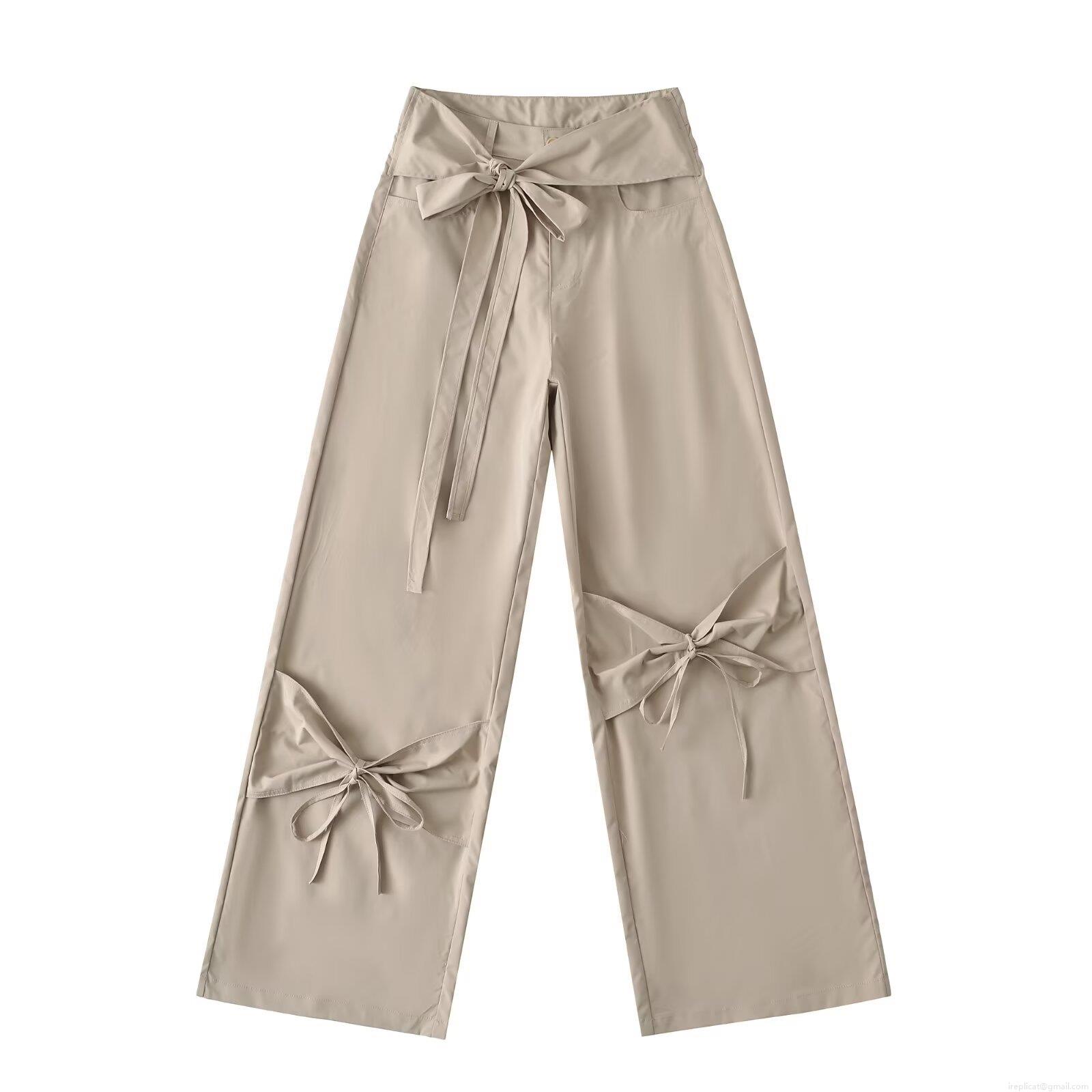 Women's Casual Wide Leg Pants Polyester Blend Bow Knot Tie Waist Loose Solid Color Streetwear Summer Trousers for Women Fashion