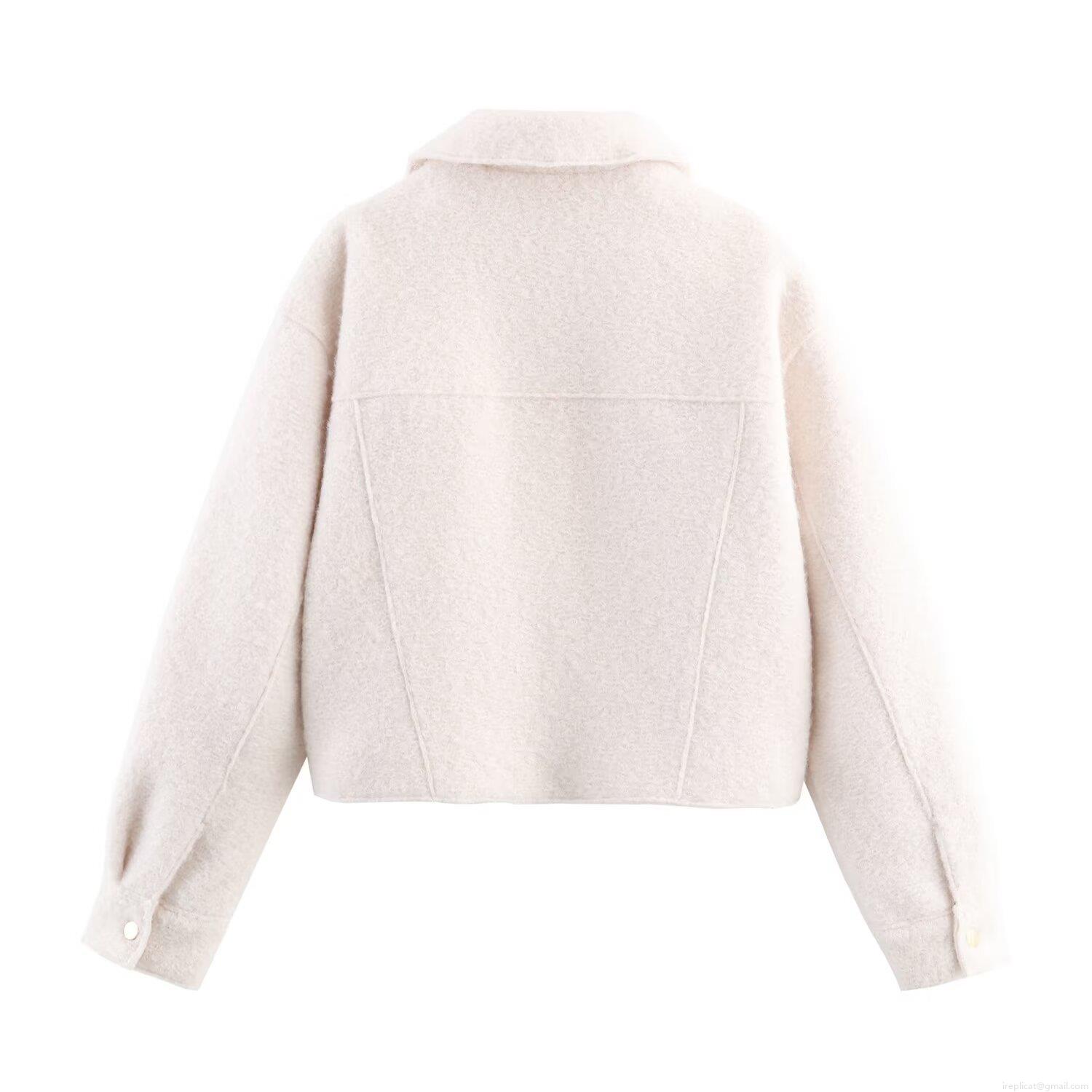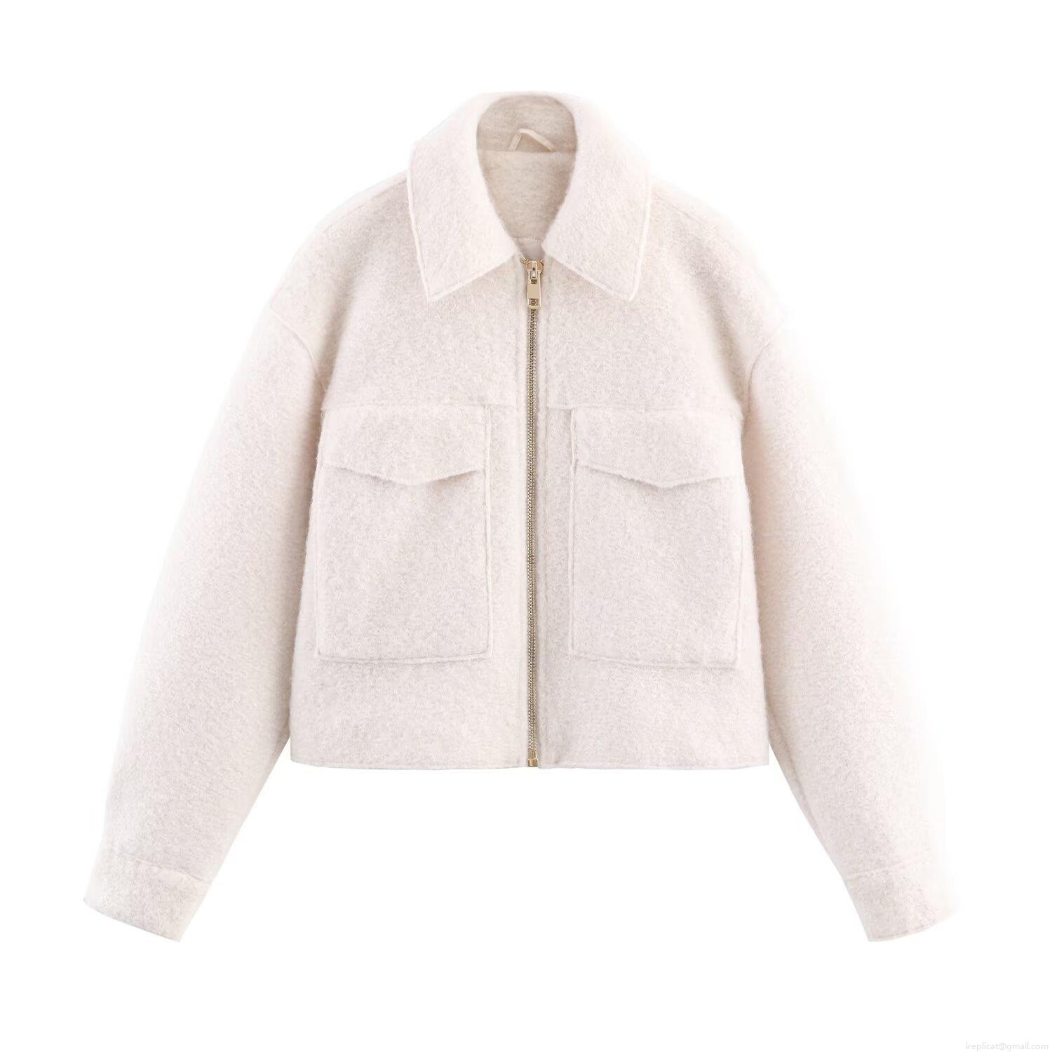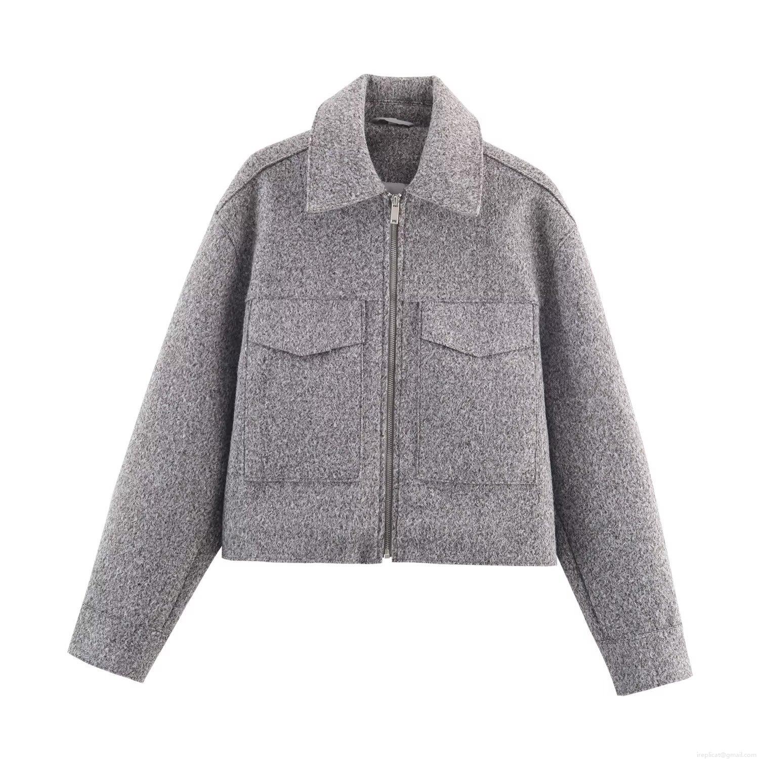 Women's Casual Woolen Crop Jacket With Front Zipper And Double Pockets Streetwear Lapel Long Sleeve Solid Color Outerwear Coat For Women