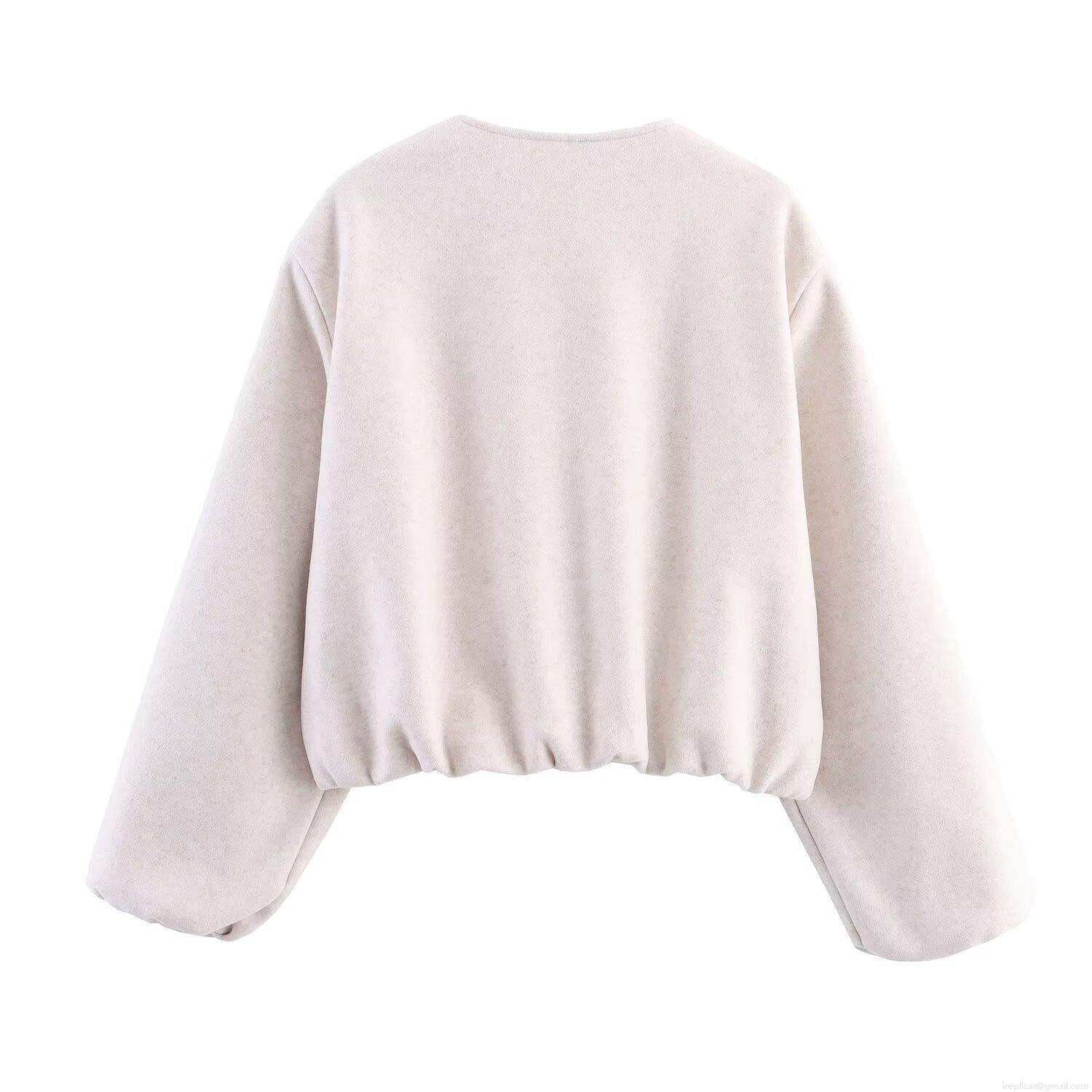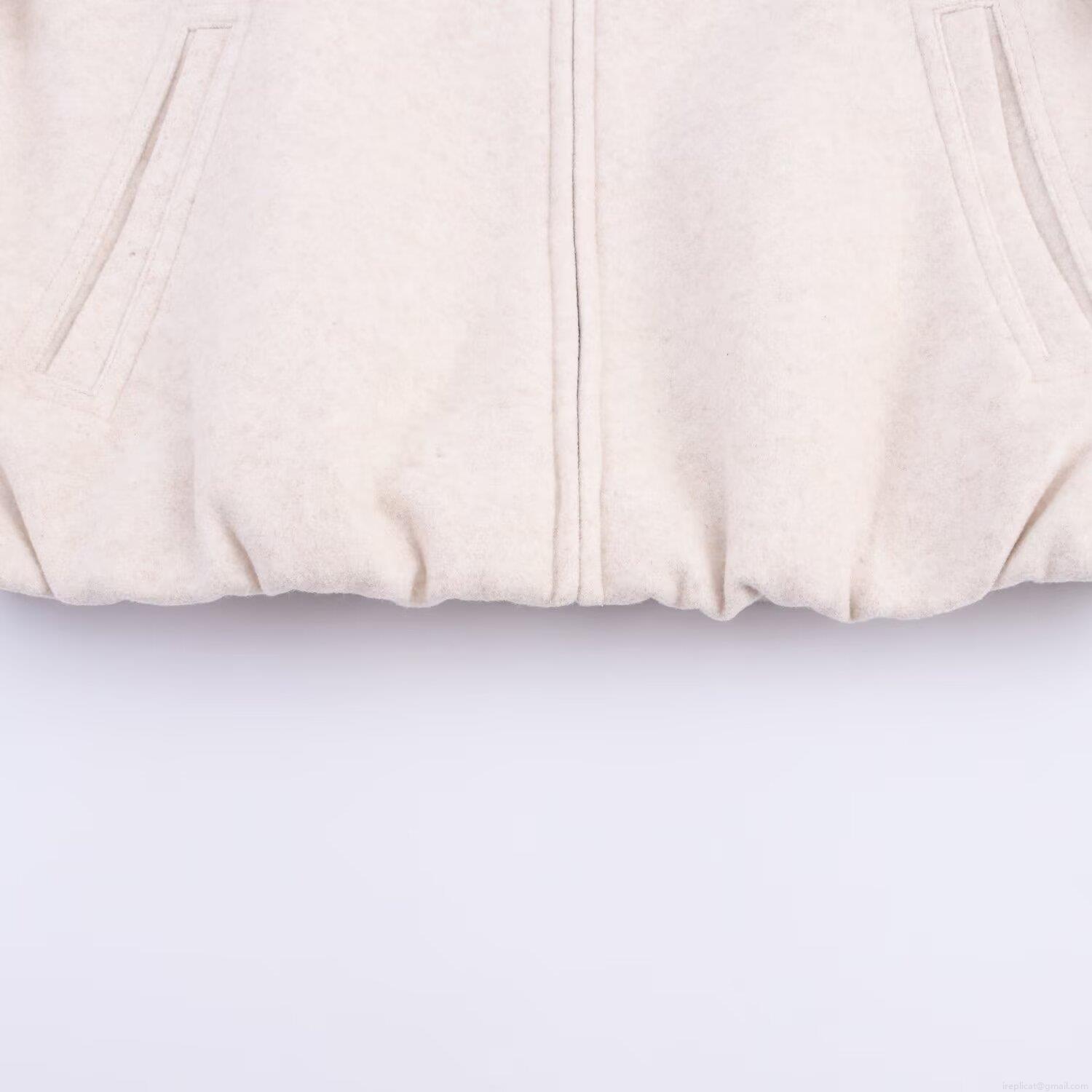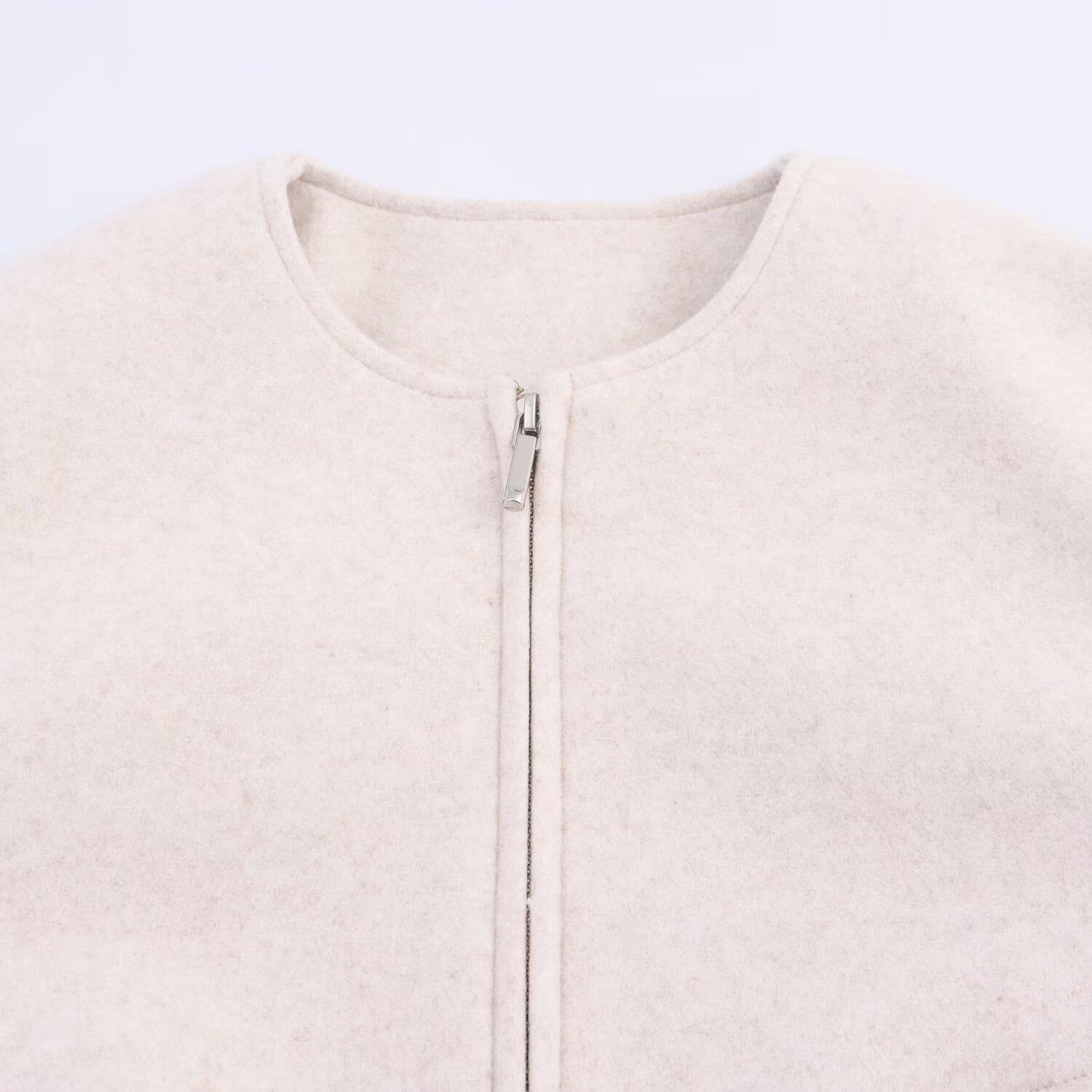 Women's Casual Woolen Soft Bomber Jacket Loose Fit Round Neck Zip Up Outerwear Solid Color Long Sleeve Ribbed Trim Short Coat for Fall Winter