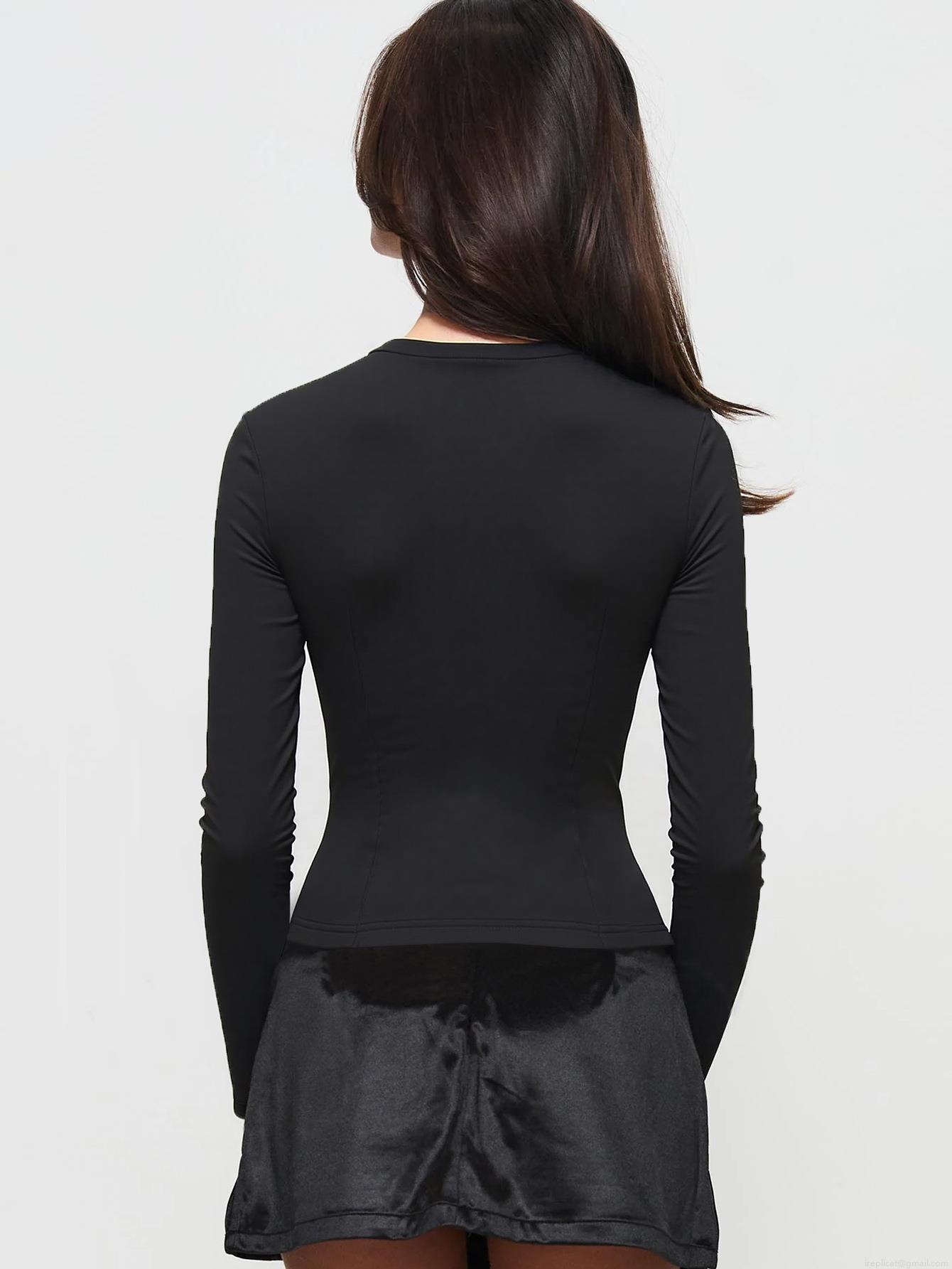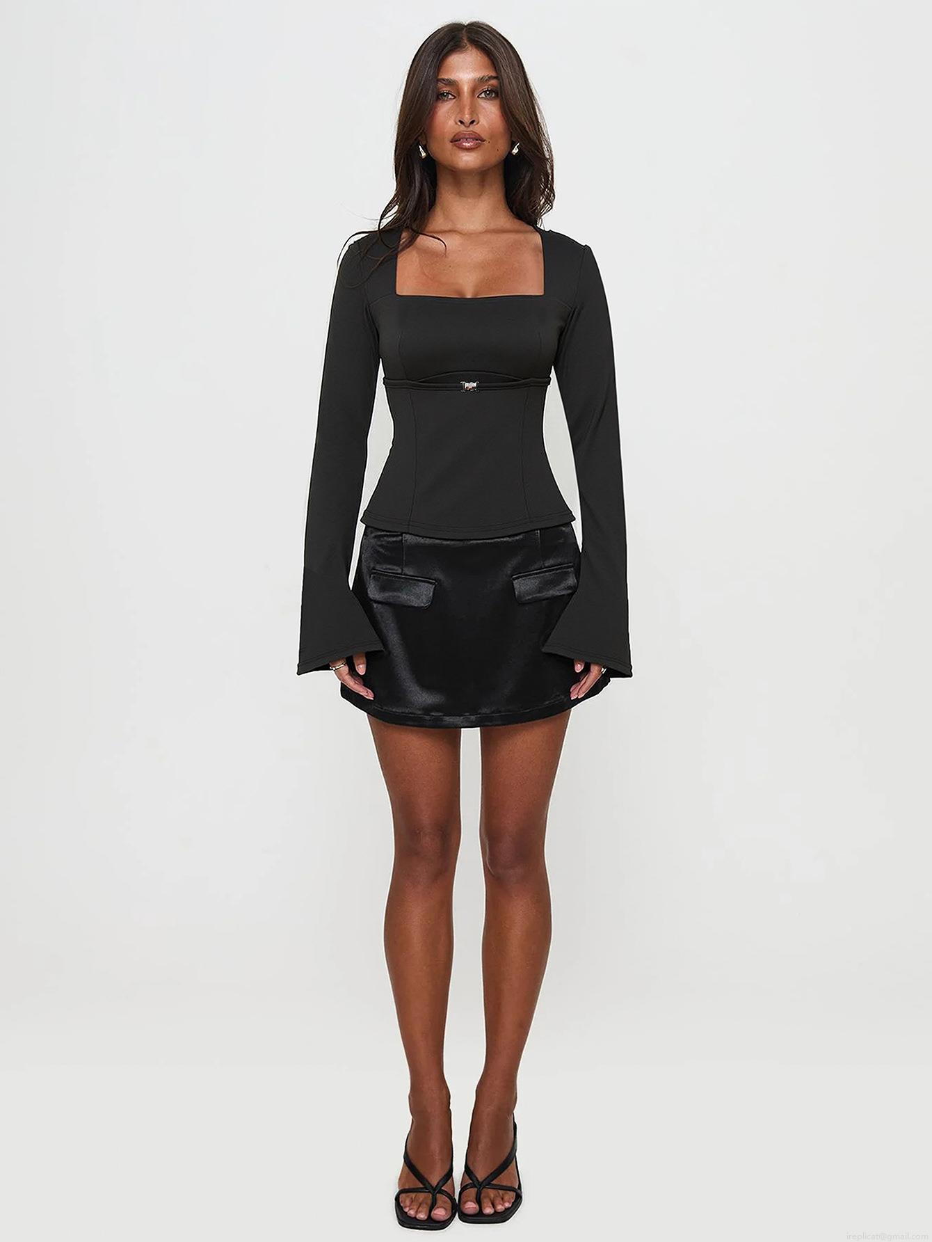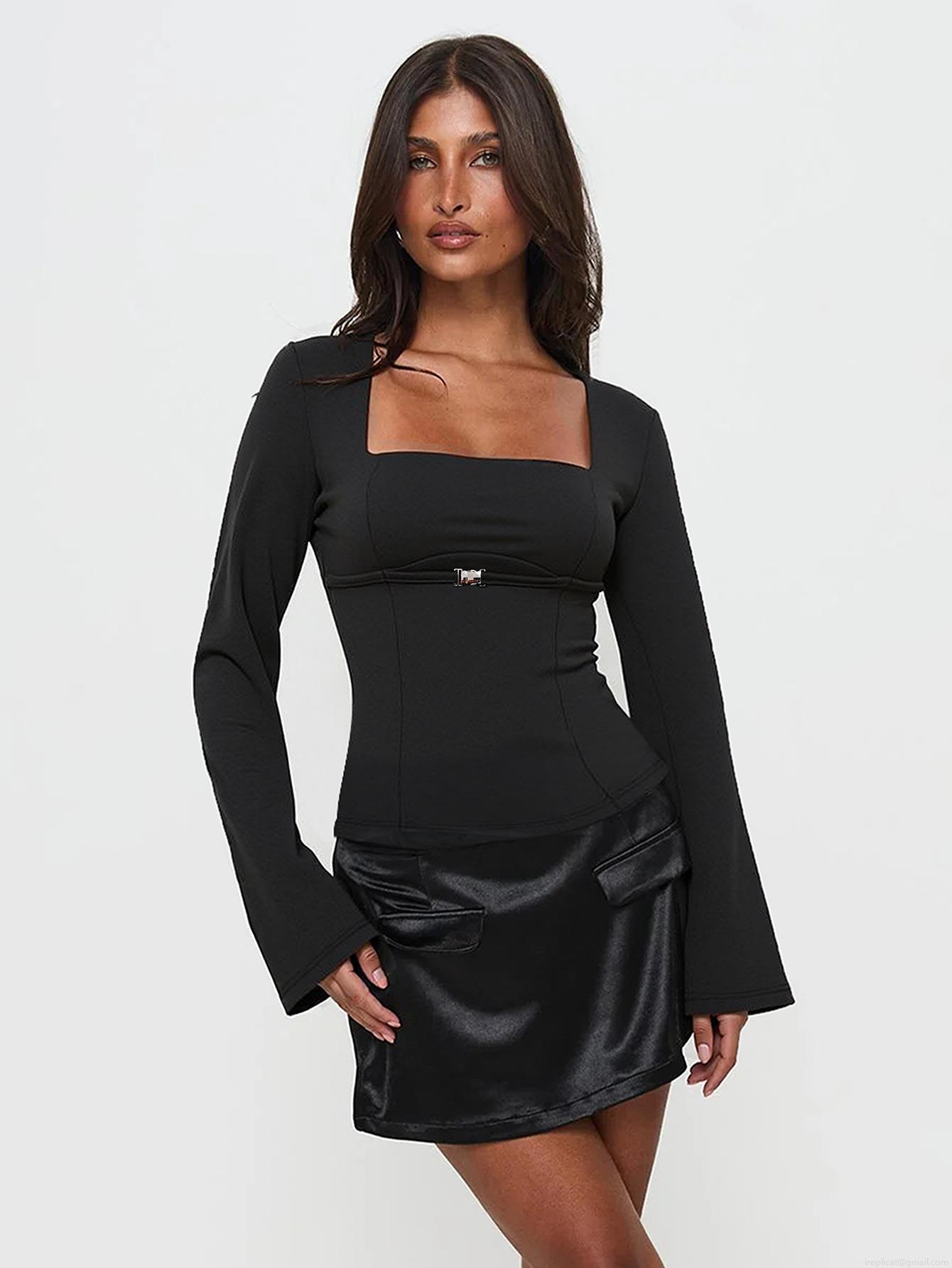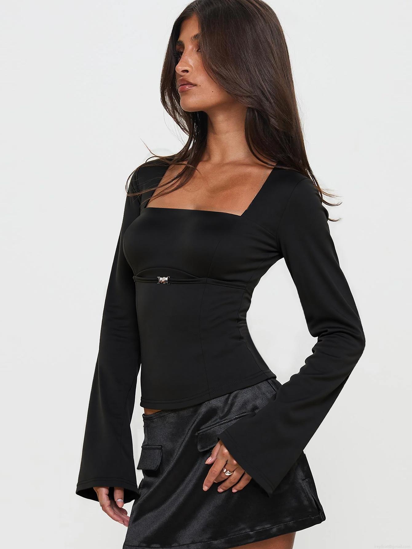 Women's Chic Square Neck Long Sleeve Top Elegant Metal Buckle Pleated Details Slim Fit Black Tee Flare Sleeve Polyester Elastane Knit Shirt For Women