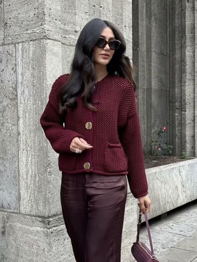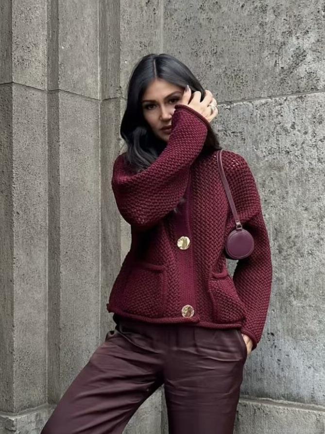 Solid Color, Single-breasted, Hollow Design, Diamond-shaped Openwork, Chunky Knit, Sticker Bag, Large Gold Buttons