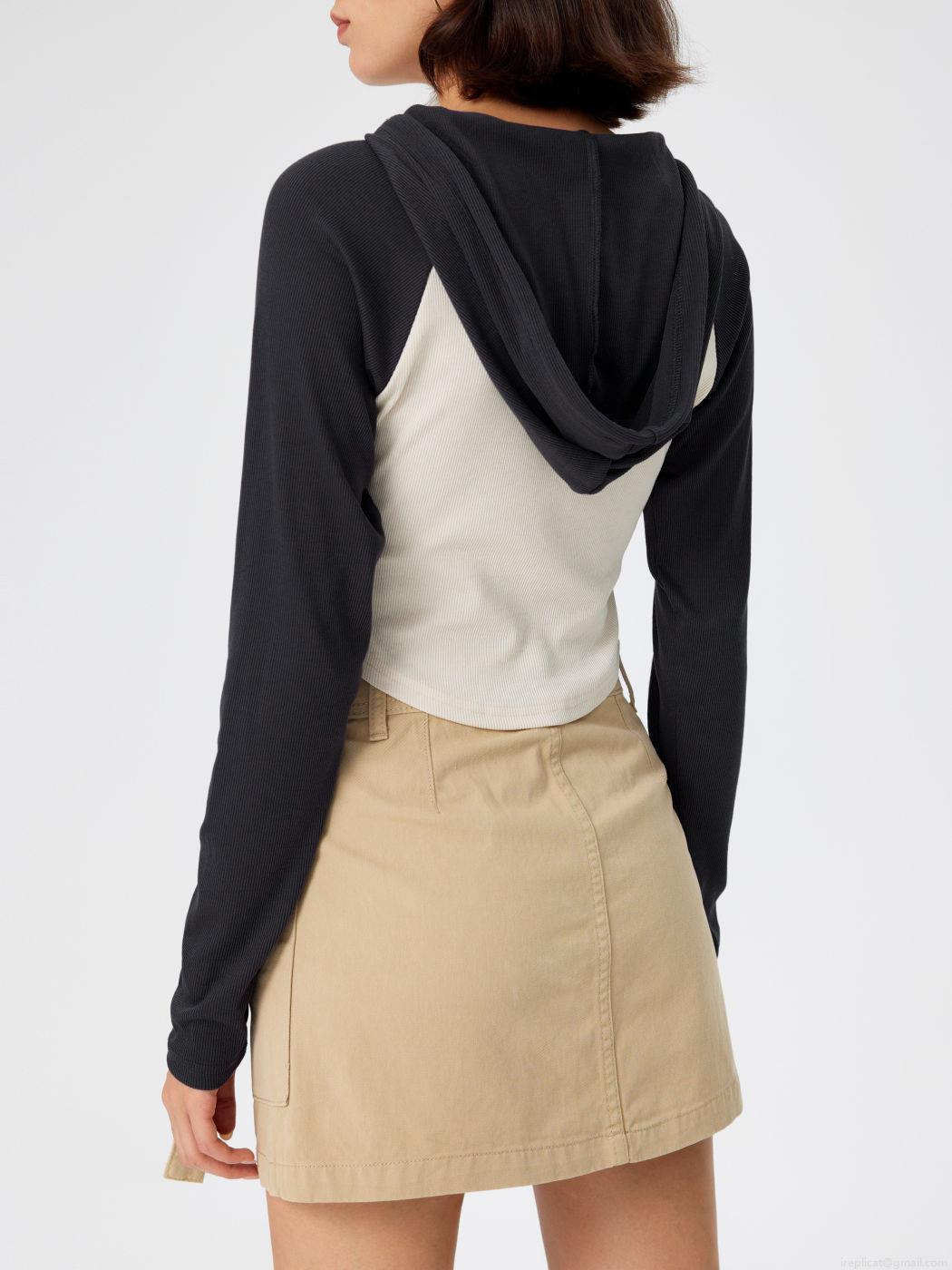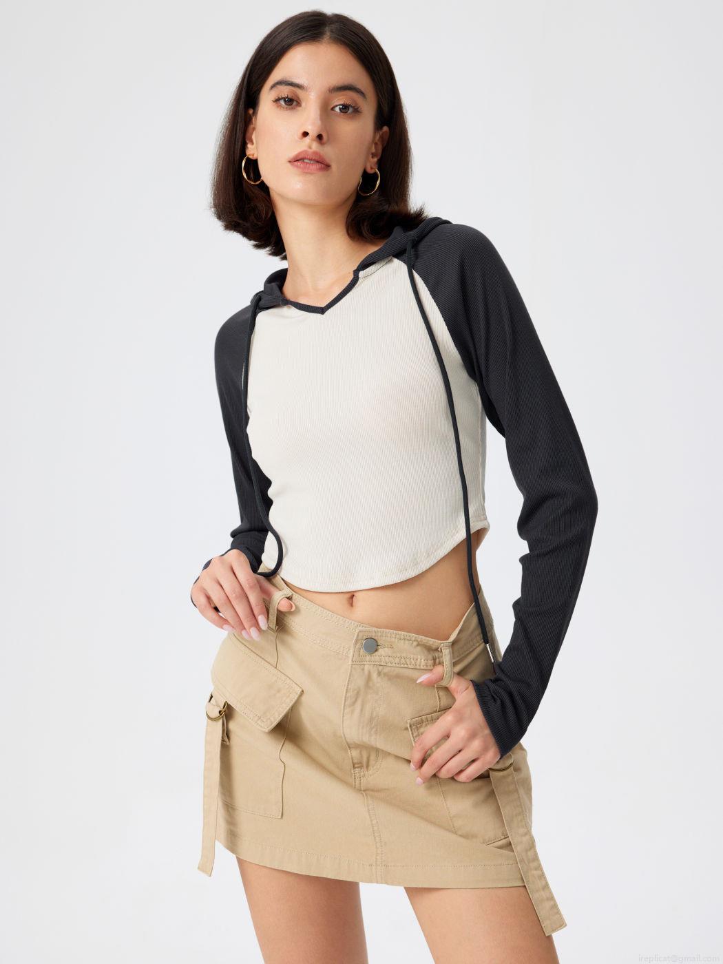 Women's Colorblock Hooded Long Sleeve T-Shirt Ribbed Knit Slim Fit Patchwork Cropped Tee Streetwear Style Patchwork Hooded Top For Women