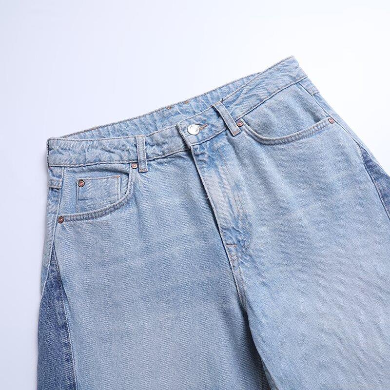 Women's Colorblock Patchwork Wide Leg Jeans High Waisted Cotton Polyester Denim Trousers Long Straight Pants with Raw Hem Streetwear