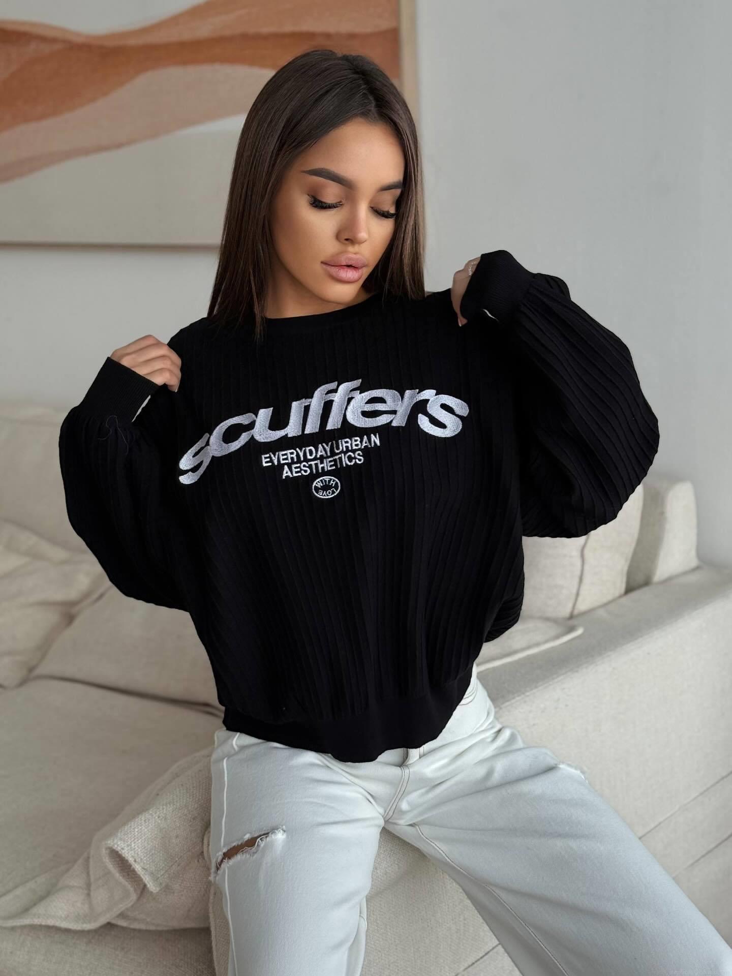 Letter Print, Ribbed Knit, Vertical Pit Stripes, Dropped Shoulder Sleeves, Loose Silhouette