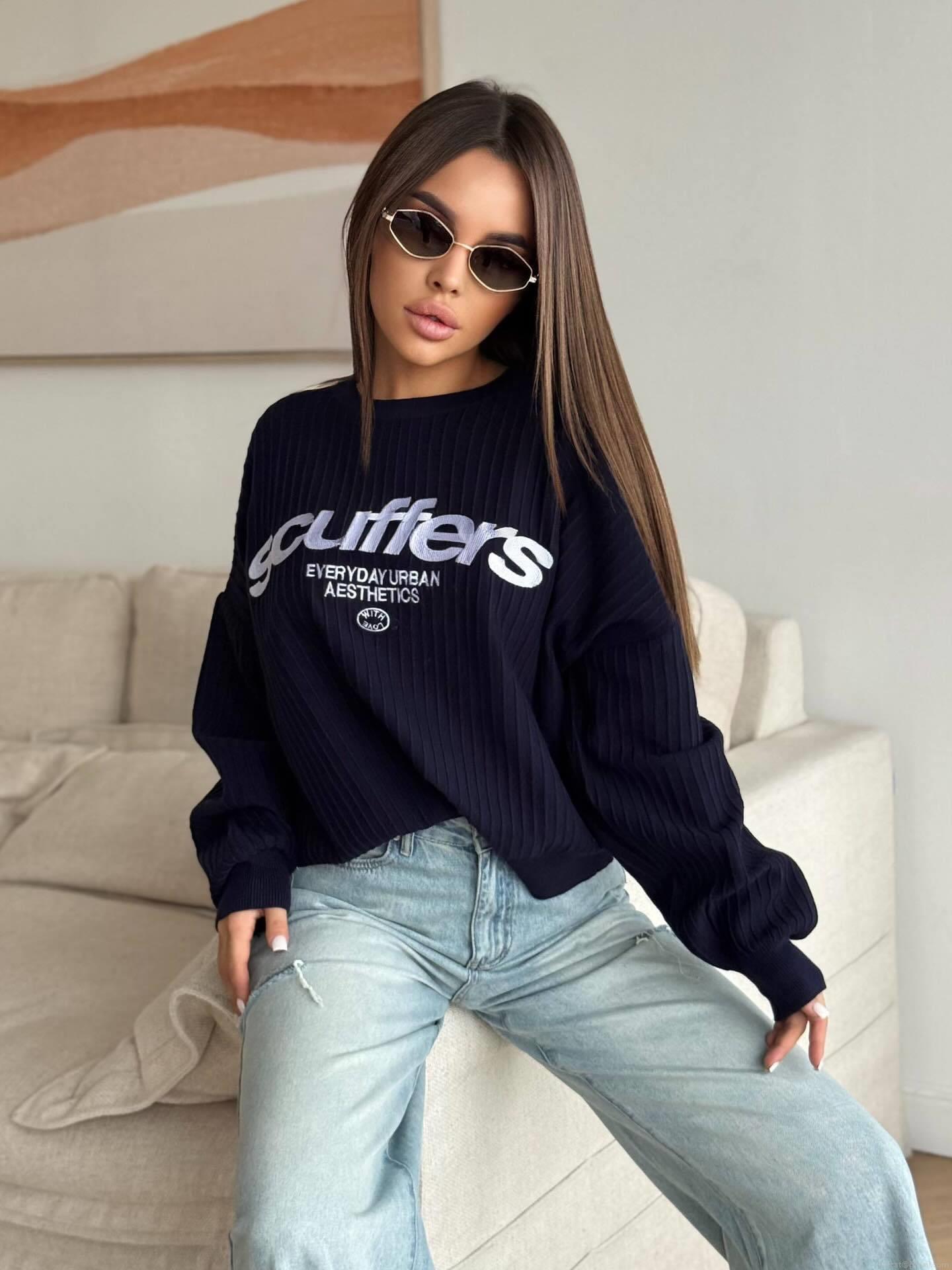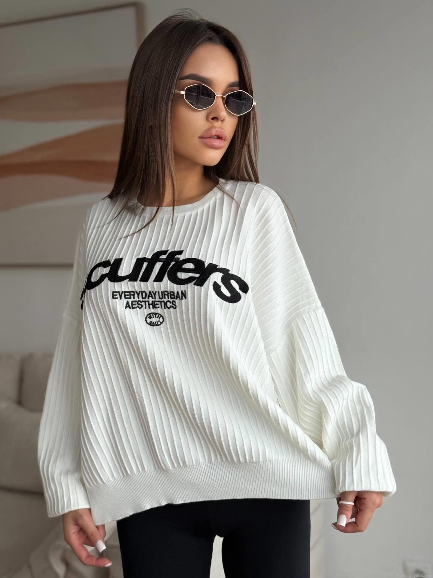 Women's Cotton Polyester Ribbed Knit Sweater Loose Crew Neck Pullover Letter Print Urban Casual Streetwear Long Sleeve Jumper Top