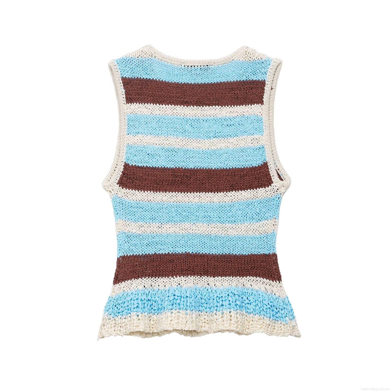 Women's Crochet Knit Striped Vest Top Color Block Sleeveless Round Neck T-Shirt For Summer Streetwear Casual Pullover Hollow Out Tank Top