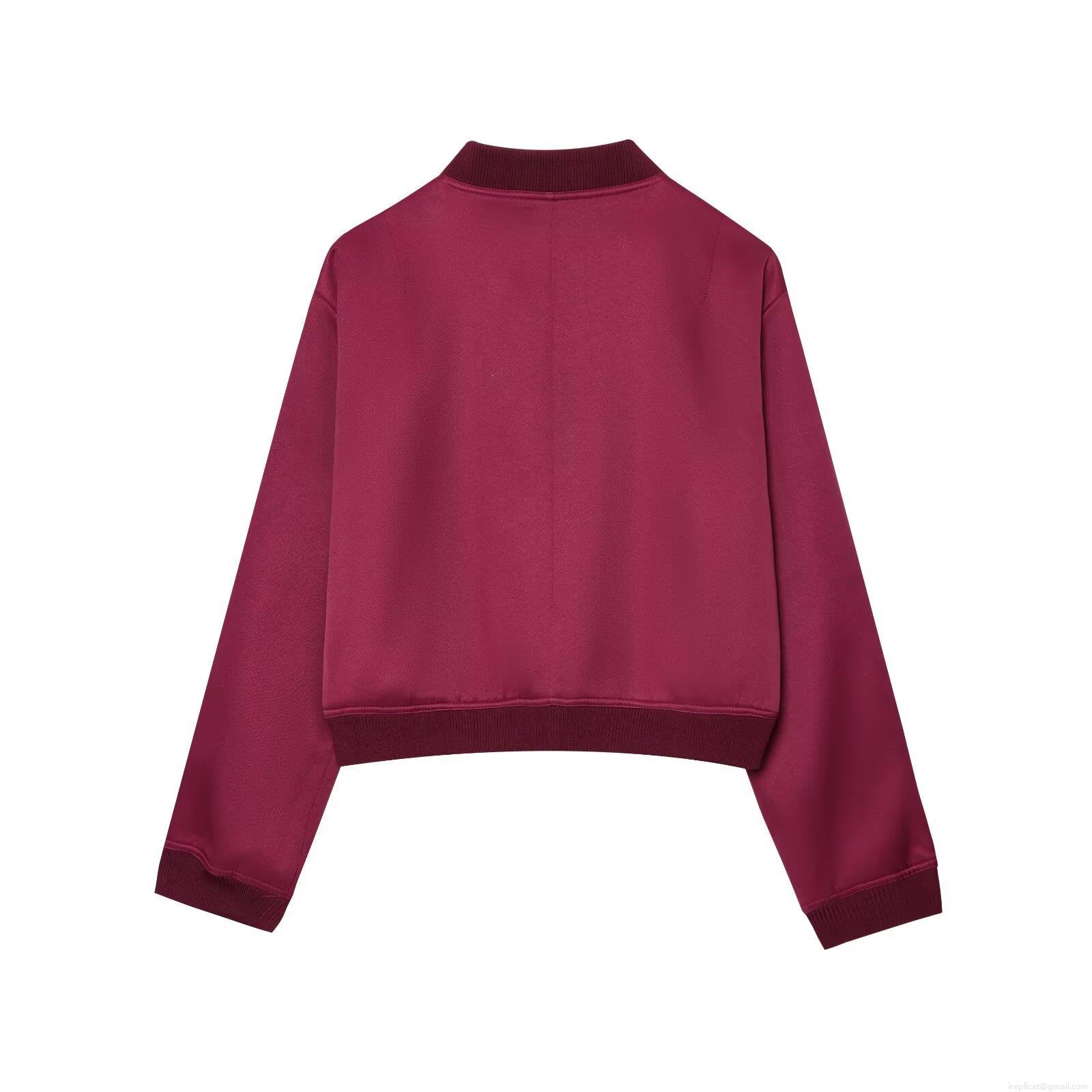 Women's Cropped Bomber Jacket Wine Red Polyester Workwear Style Short Coat with Flap Pockets Snap Buttons Long Sleeve Outerwear for Casual Street Fashion Ladies
