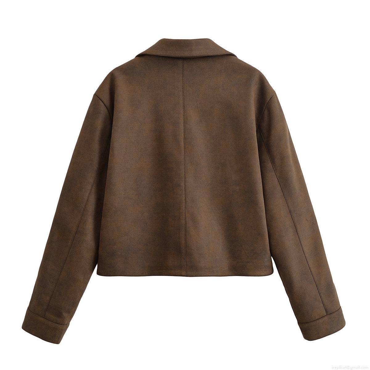Women's Cropped Faux Suede Jacket Retro Moto Style Button Down Lapel Long Sleeve Short Coat For Autumn Winter Streetwear Brown Outwear