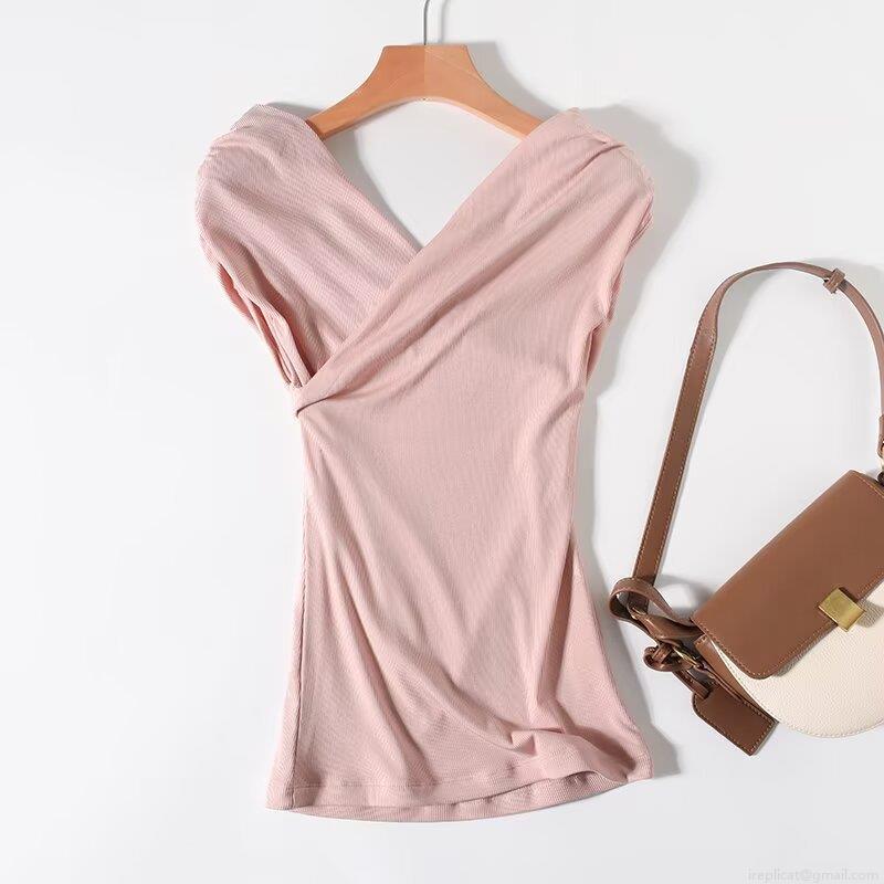 Women's Cross Front V Neck T-Shirt Ribbed Lyocell Spandex Knit Slim Fit Short Sleeve Top Elegant Commuter Solid Color Summer Breathable Tee For Women
