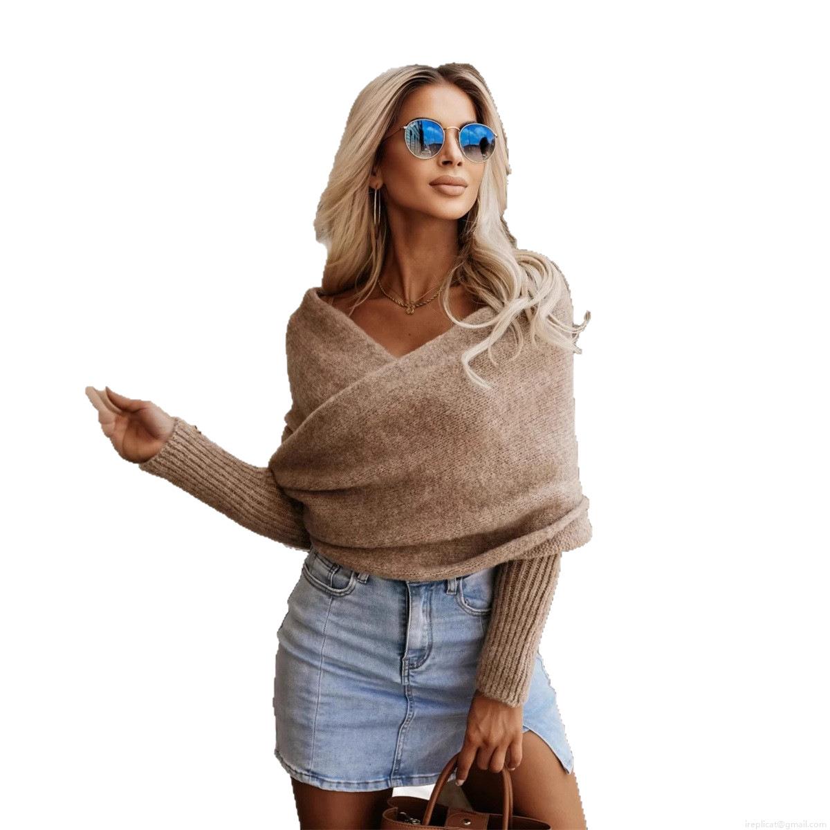 Women's Cross Wrap V Neck Knitted Sweater Off Shoulder Long Sleeve Sexy Slim Fit Polyester Knit Top Scarf Collar Multi-way Wear Fashion Pullover Jumper