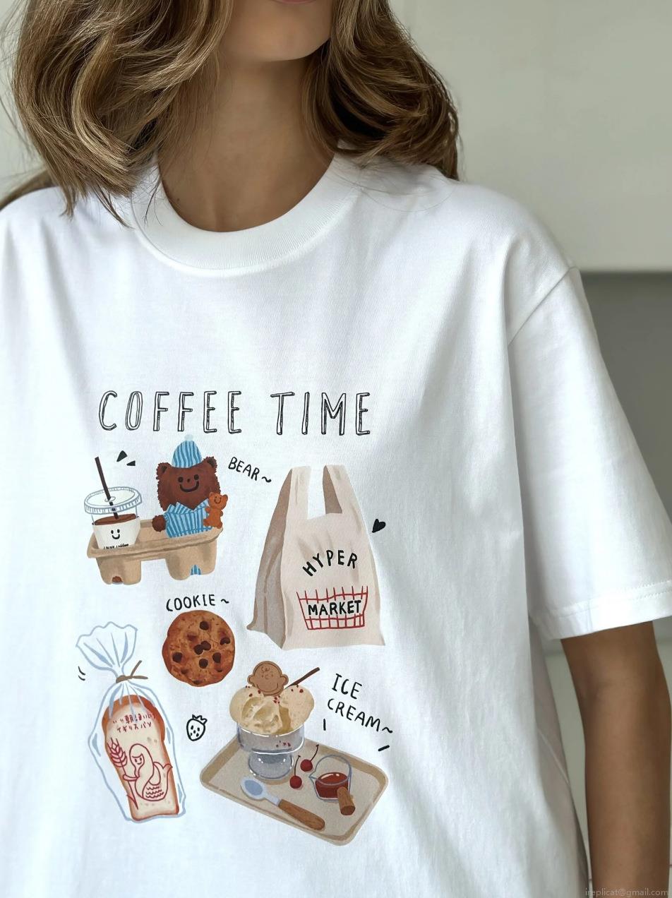 Women's Cute Cartoon Bear Coffee Graphic Print Cotton Blend T-Shirt Round Neck Short Sleeve Loose Fit Casual Summer Streetwear Tee Top White