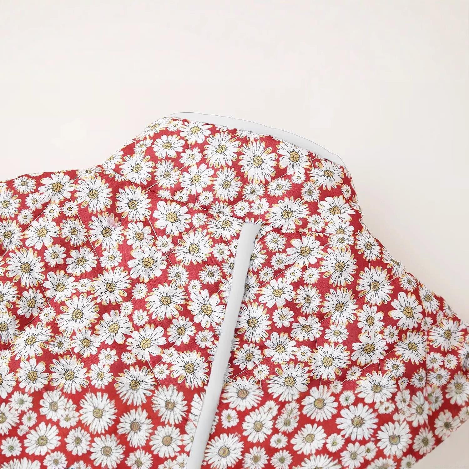 Women's Daisy Print Quilted Cotton Jacket Retro Floral Stand Collar Padded Outerwear Button Down Lightweight Warm Coat for Autumn Winter