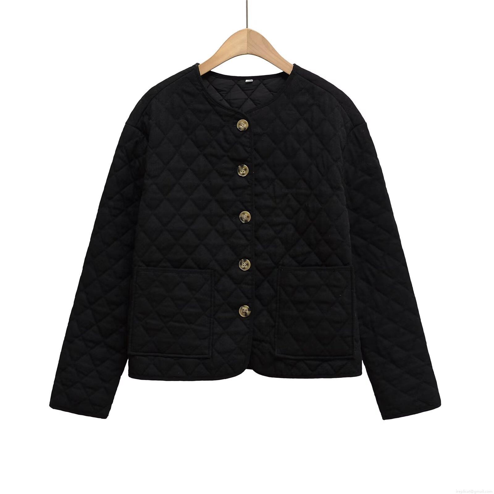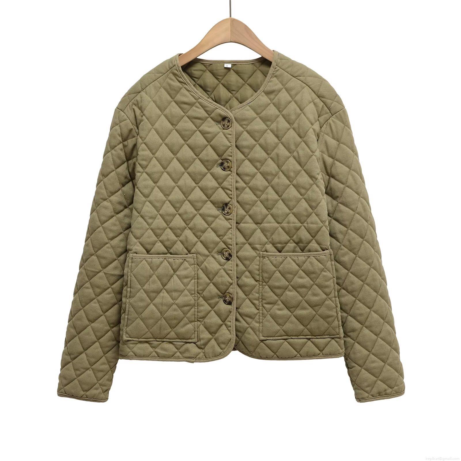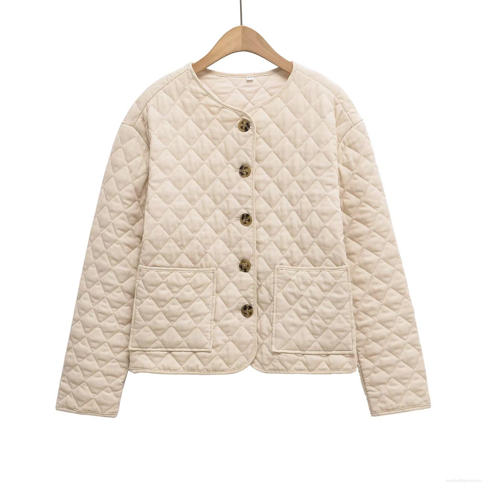 Women's Diamond Quilted Jacket Padded Round Neck Button Up Short Coat Casual Loose Outerwear For Winter Autumn