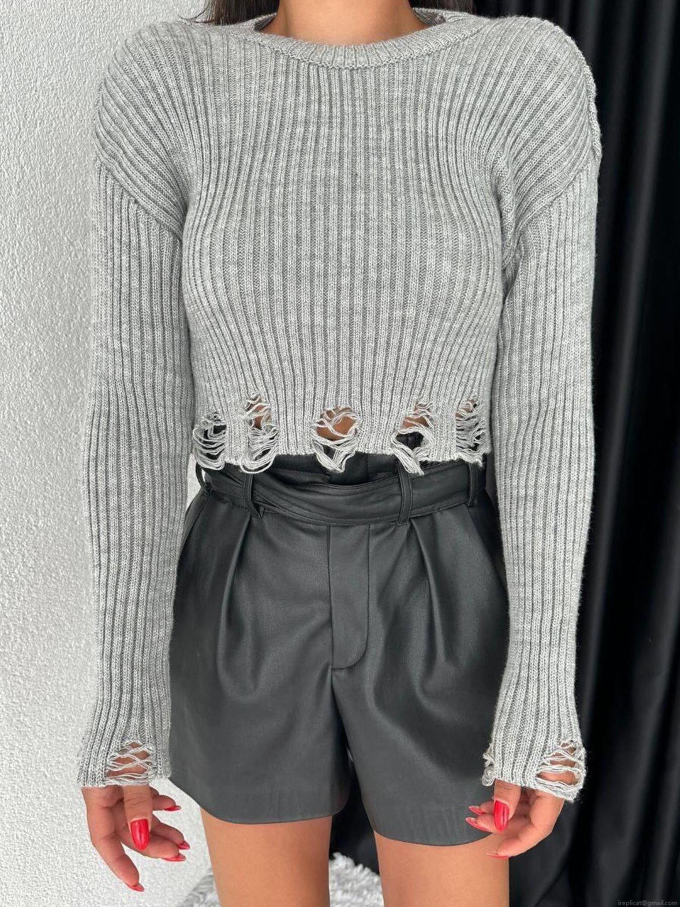 Women's Distressed Cropped Knit Sweater Cotton Polyester Pullover Round Neck Long Sleeve Ripped Ribbed Jumper For Streetwear Spicy Girl Autumn Winter