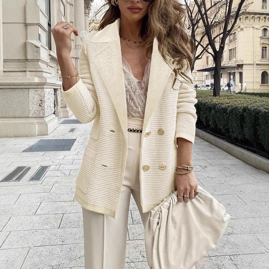 Solid Color, Double-breasted, Gold Buttons, Suit Collar, Horizontal Ribs, Horizontal Rib Texture