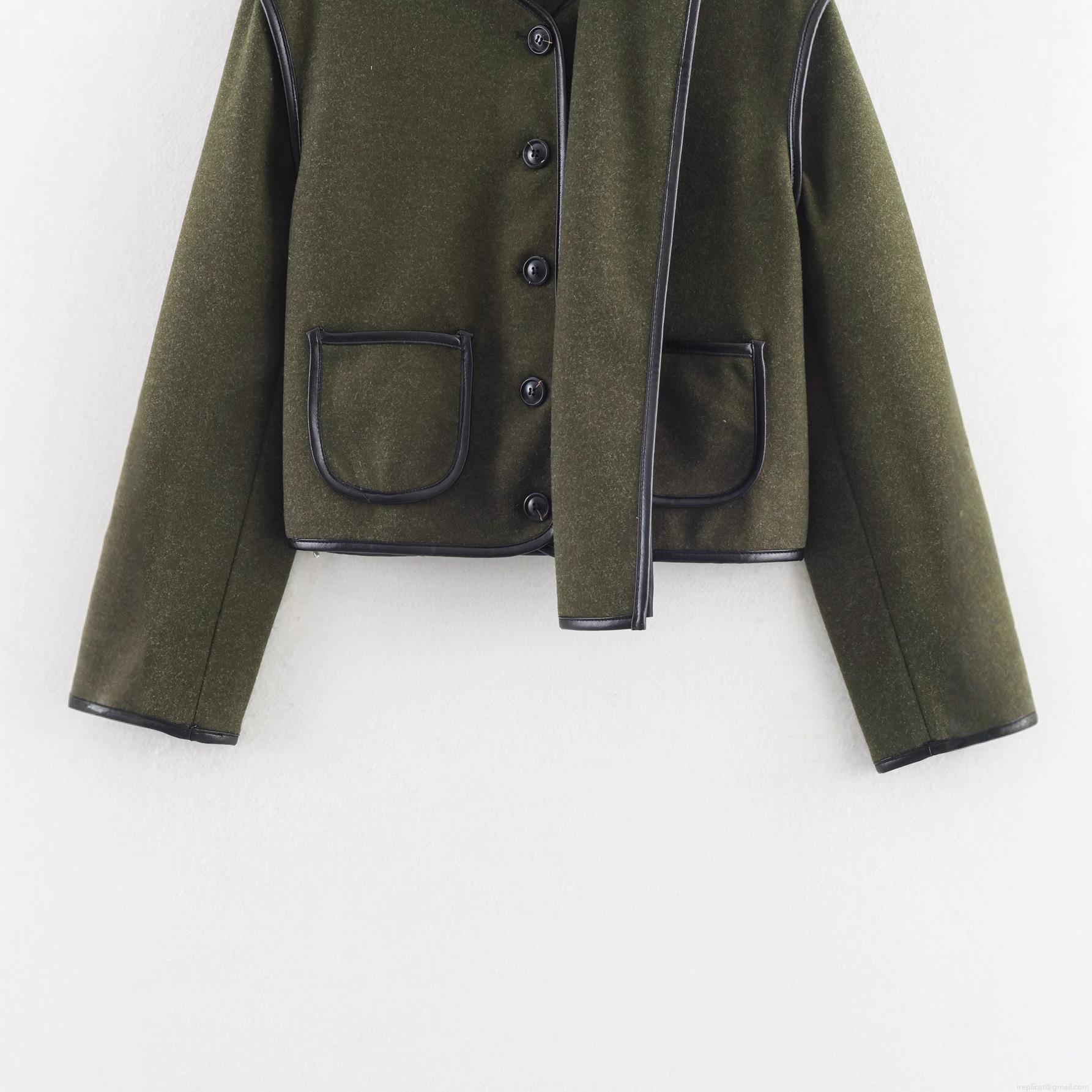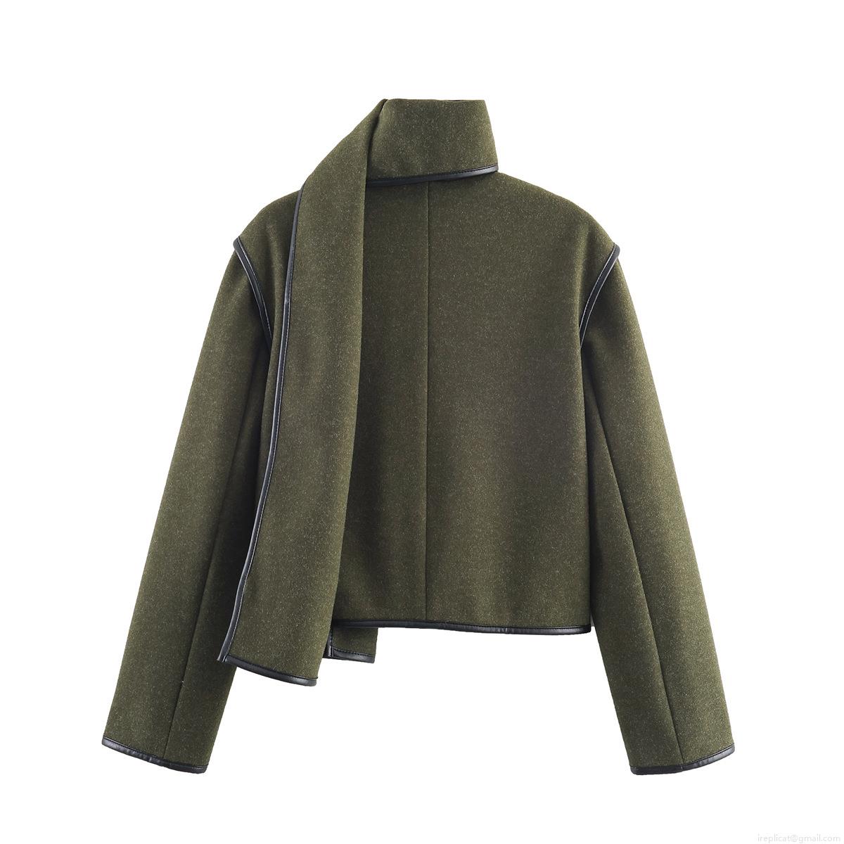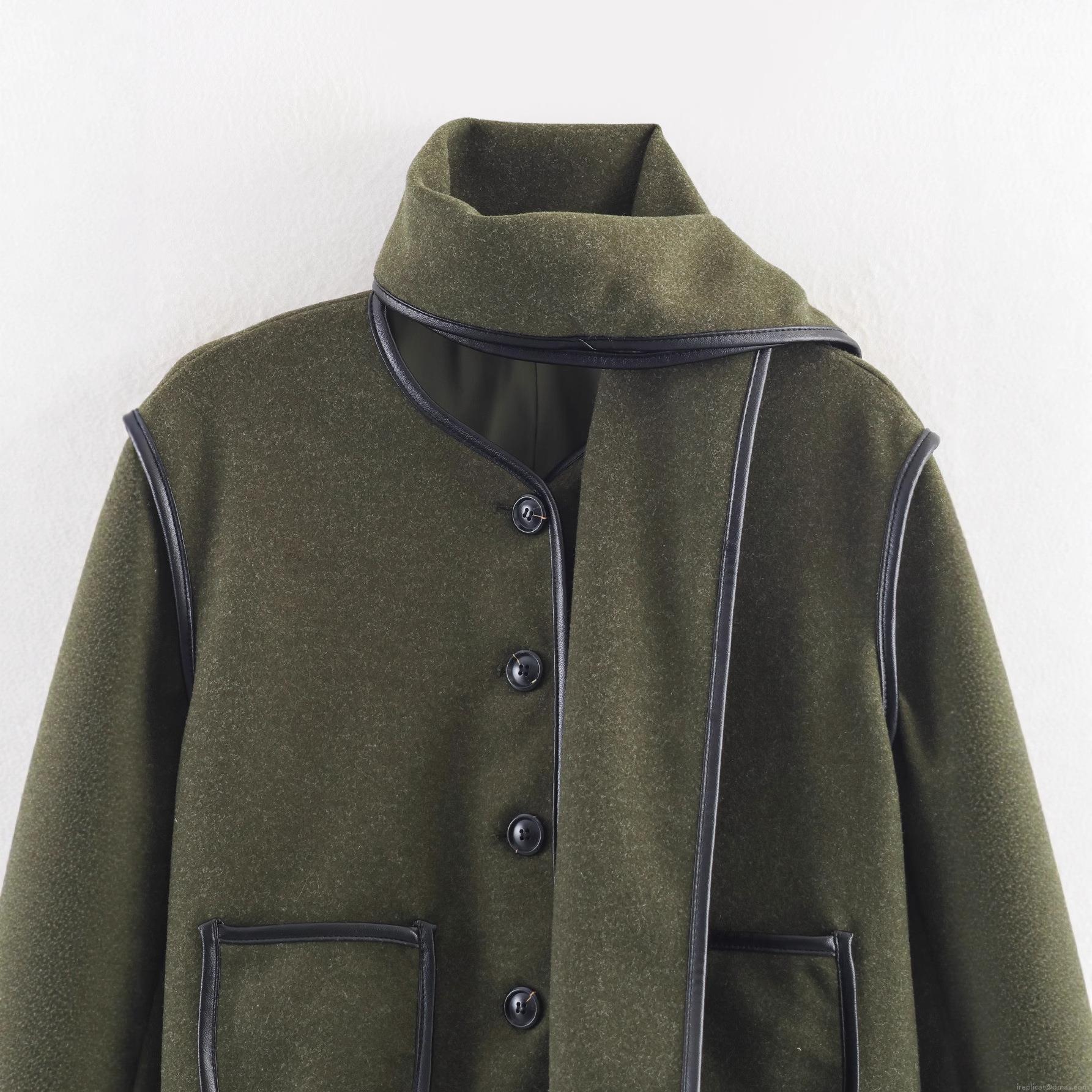 Women's Elegant Army Green Woolen Jacket With Matching Scarf Faux Leather Trim Short Coat Casual Chic Party Outerwear Polyester Solid Color Long Sleeve Jacket