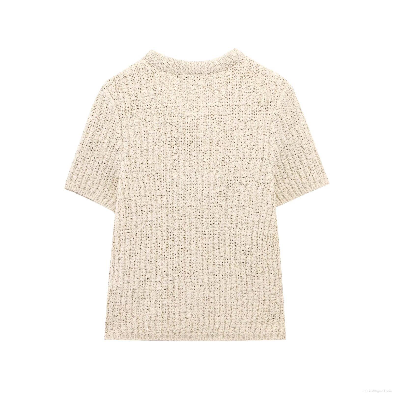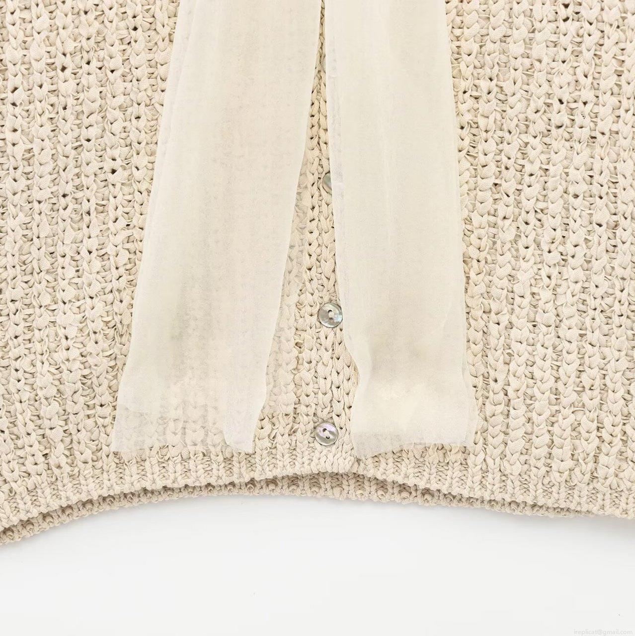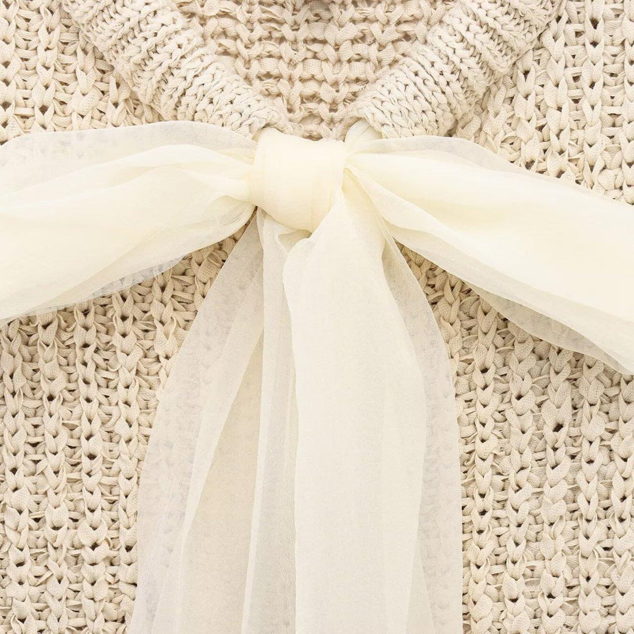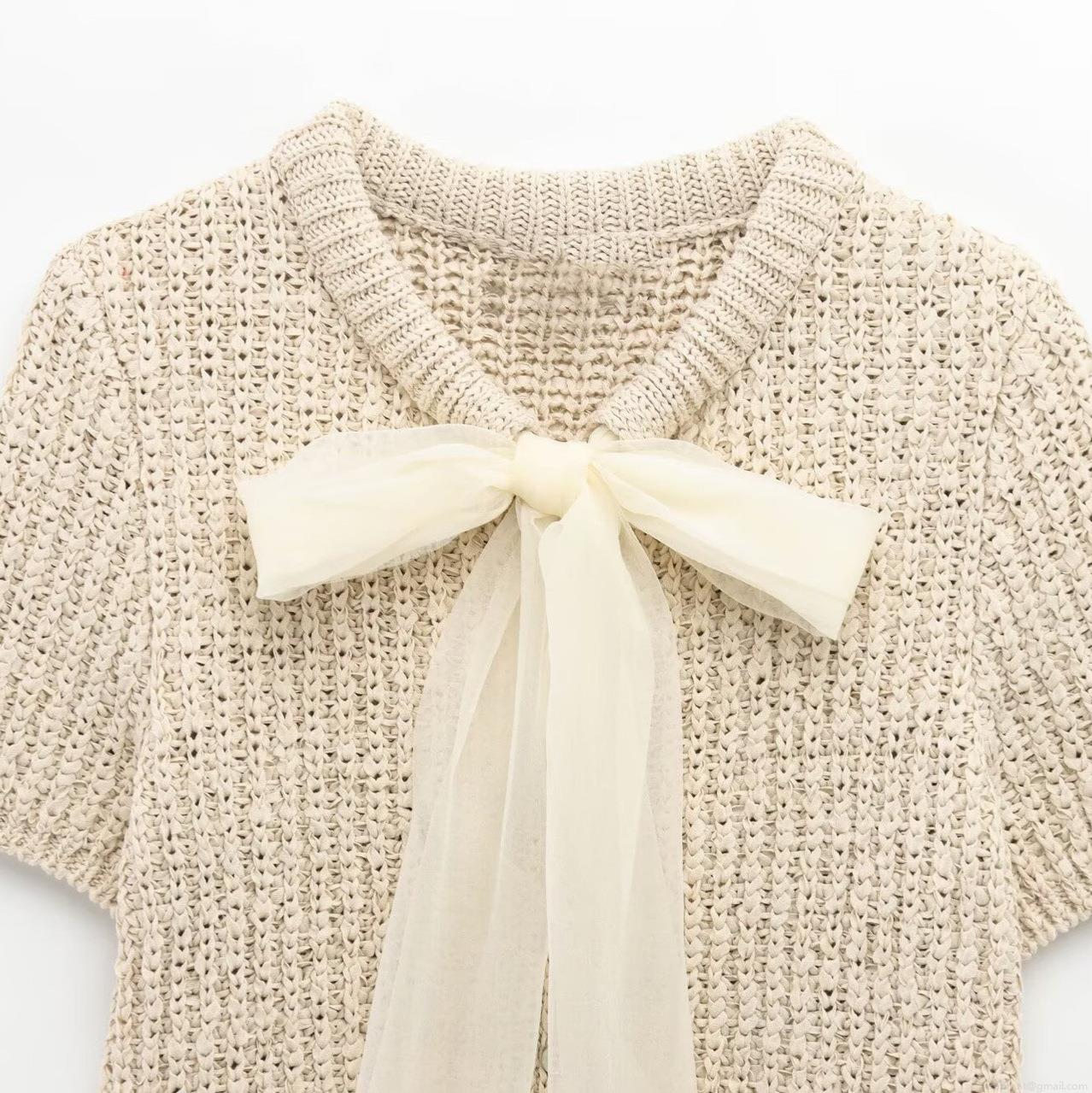 Women's Elegant Beige Short Sleeve Knit Cardigan Top With White Organza Bow Decoration Summer Fashion Single Breasted Chunky Knit Sweater For Women