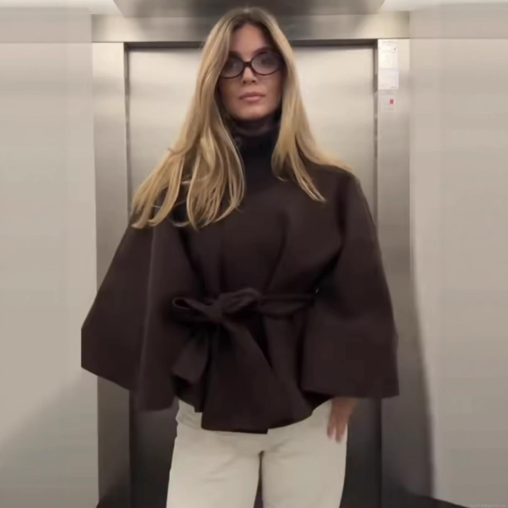 Women's Elegant Cape Coat Woolen Blend Stand Collar Short Cloak Jacket With Belt Solid Color Urban Fashion Outerwear For Autumn Winter Ladies