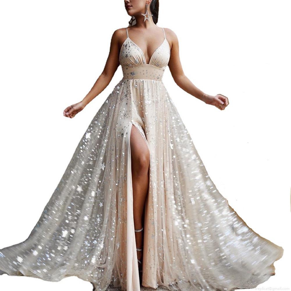 Women's Elegant Champagne Sequin Maxi Dress Sexy Deep V Neck Cami High Slit Star Tulle Evening Gown Floor Length Party Wedding Dress