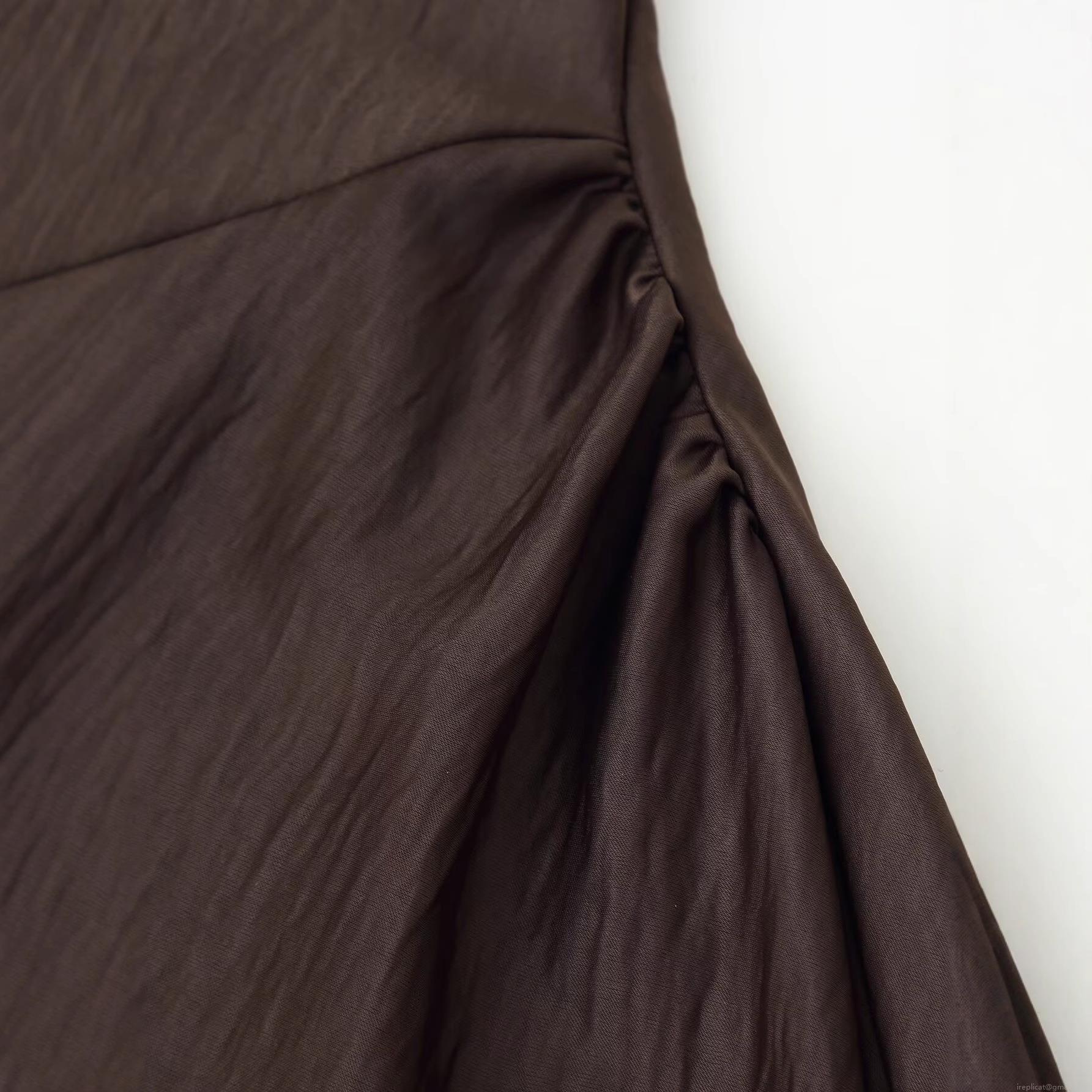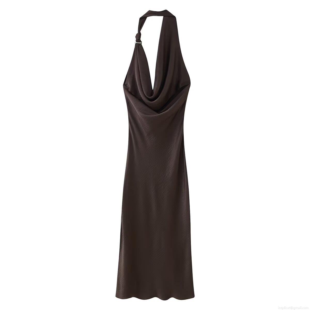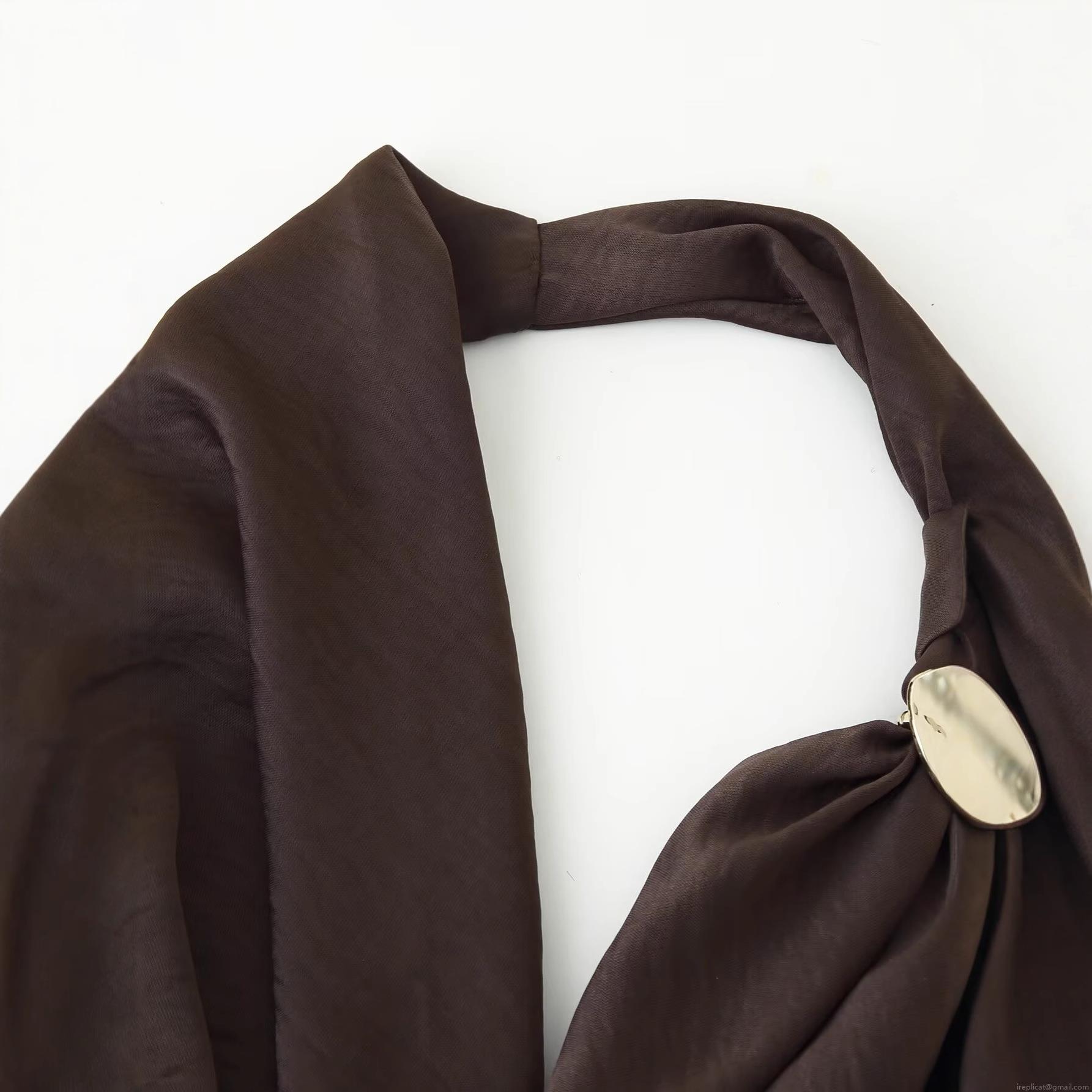 Women's Elegant Coffee Satin Halter Neck Backless Midi Dress With Metal Ring Detail Irregular Hem Ruched Bodycon Party Evening Maxi Dress