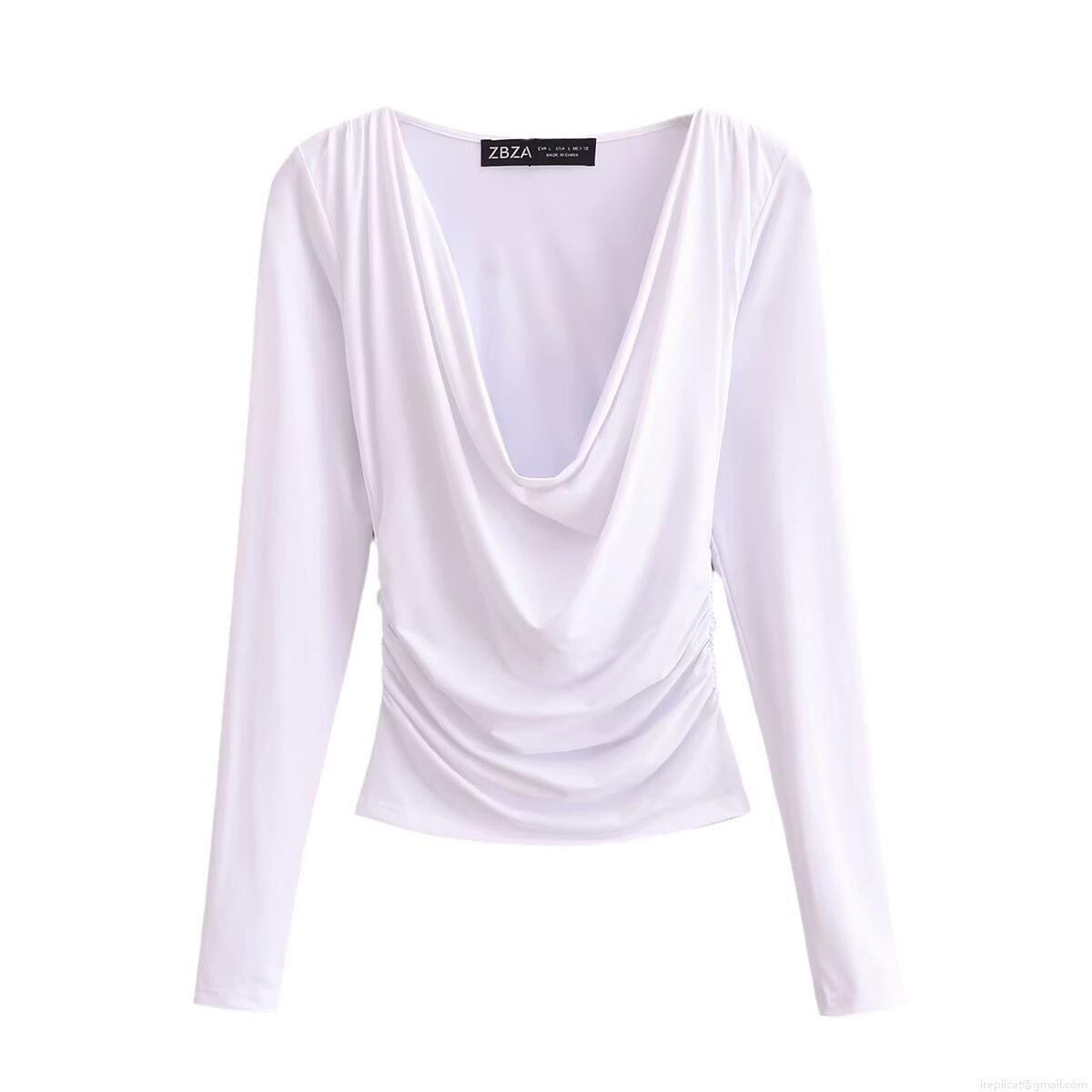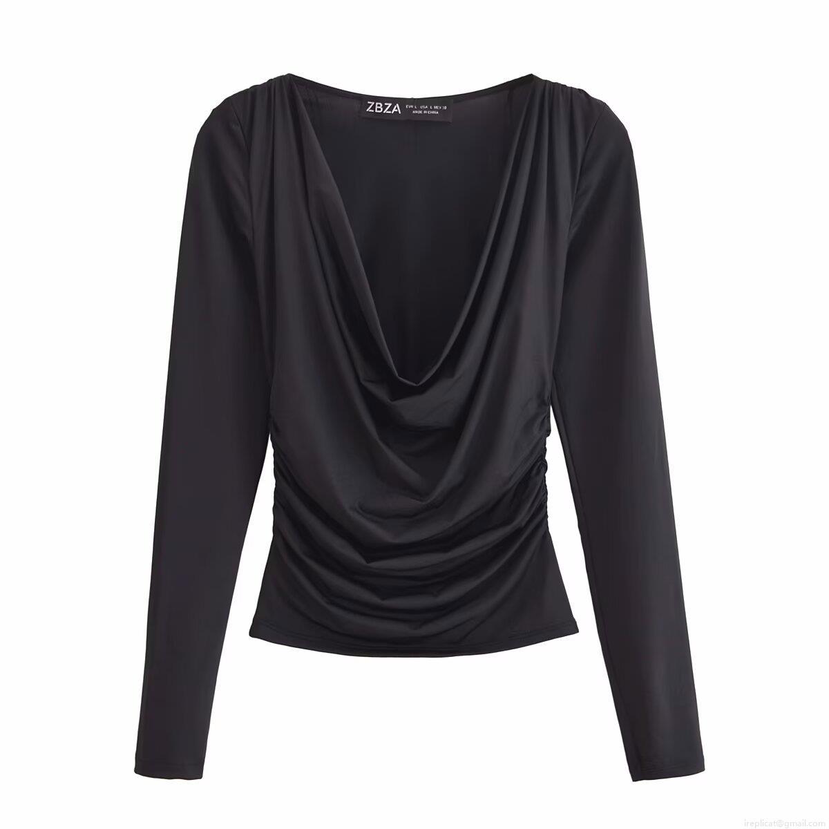 Women's Elegant Cowl Neck Long Sleeve Top Polyester Spandex Ruched Side Slim Fit Solid Color Blouse For Daily Streetwear