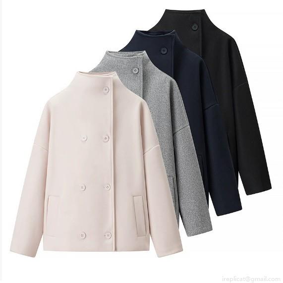Women's Elegant Double Breasted Woolen Blend Short Coat Stand Collar Casual Loose Jacket Office Wear Solid Color Outwear
