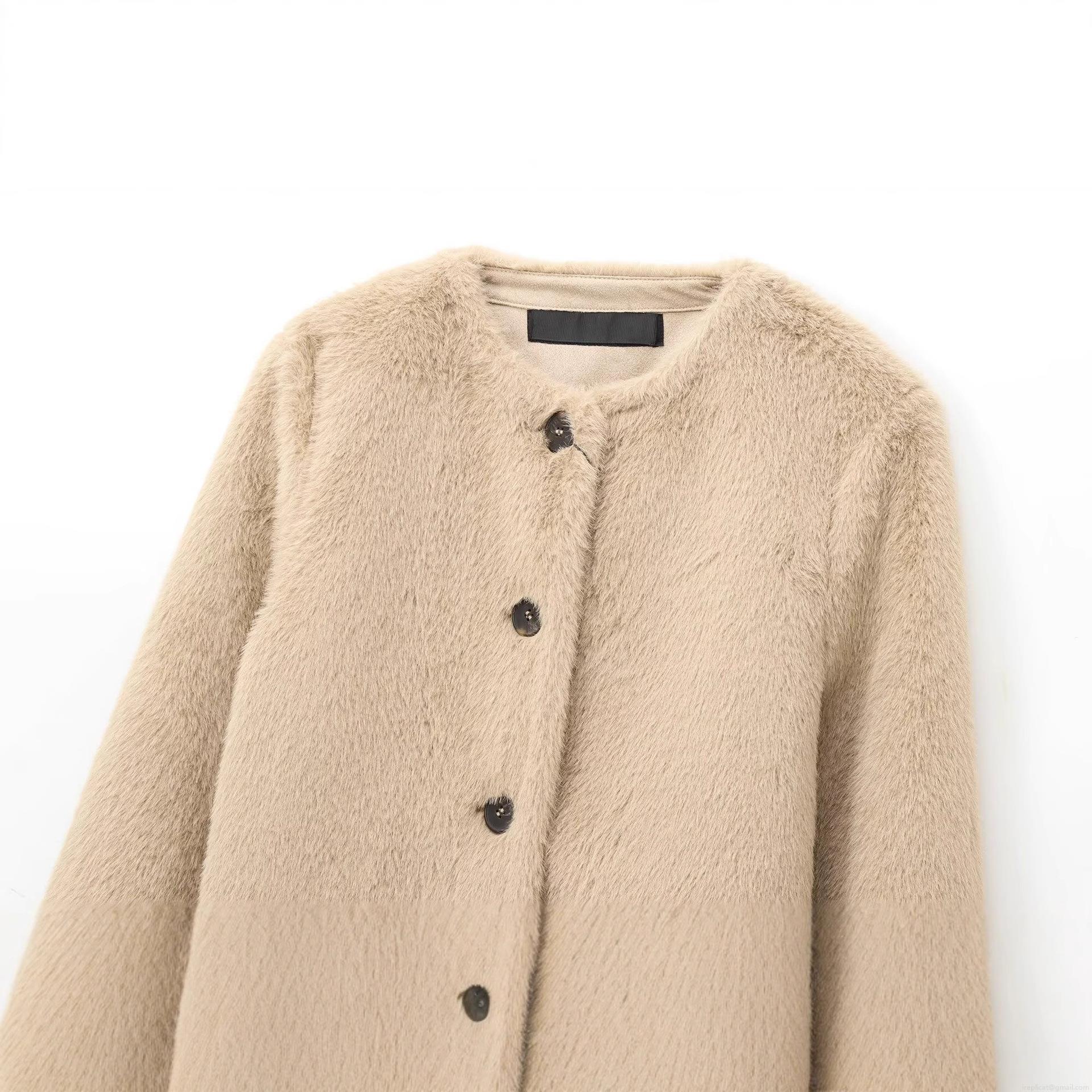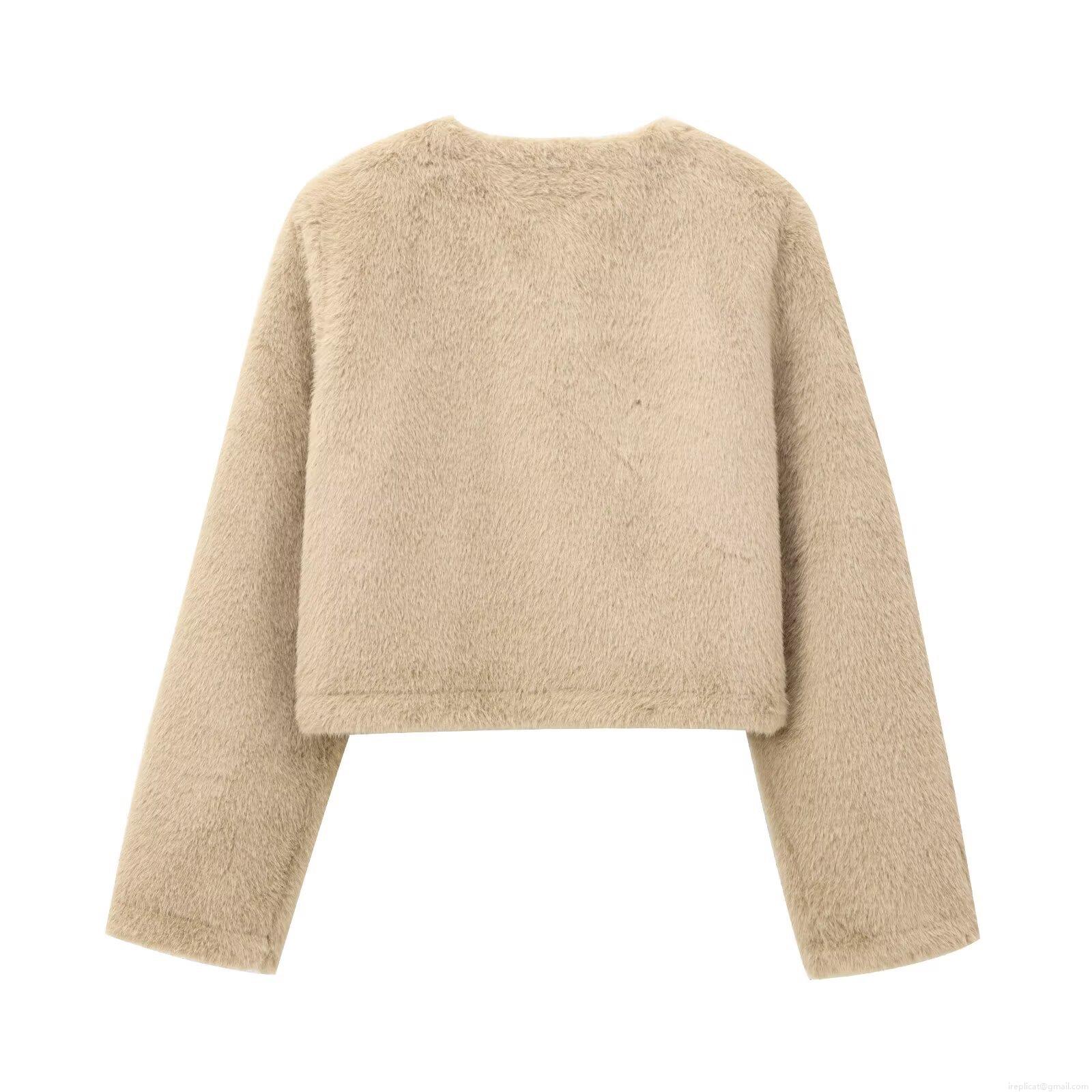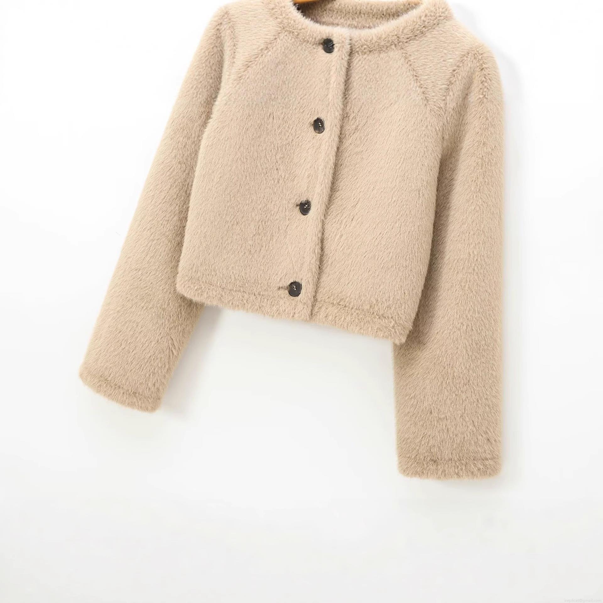 Women's Elegant Faux Fur Short Jacket Luxury Solid Color Round Neck Single Breasted Coat Suede Lining Long Sleeve Warm Outwear for Winter Autumn Streetwear Party