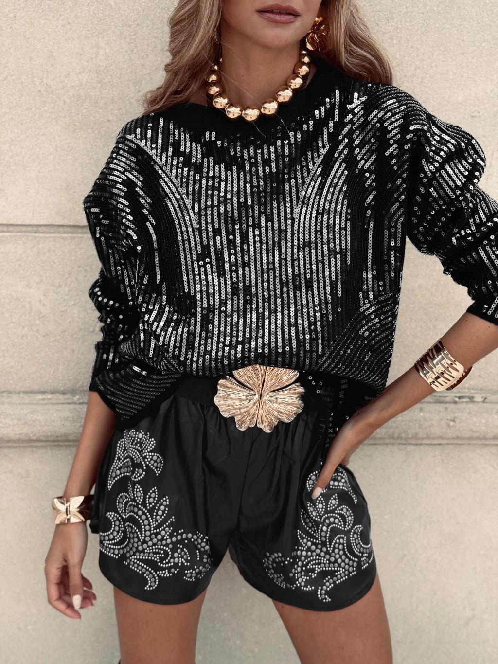 Women's Elegant High-End Sequin Knit Top Heavy Industry Long Sleeve Round Neck Loose Pullover T-Shirt For Party Fashion Women Socialite Clothes