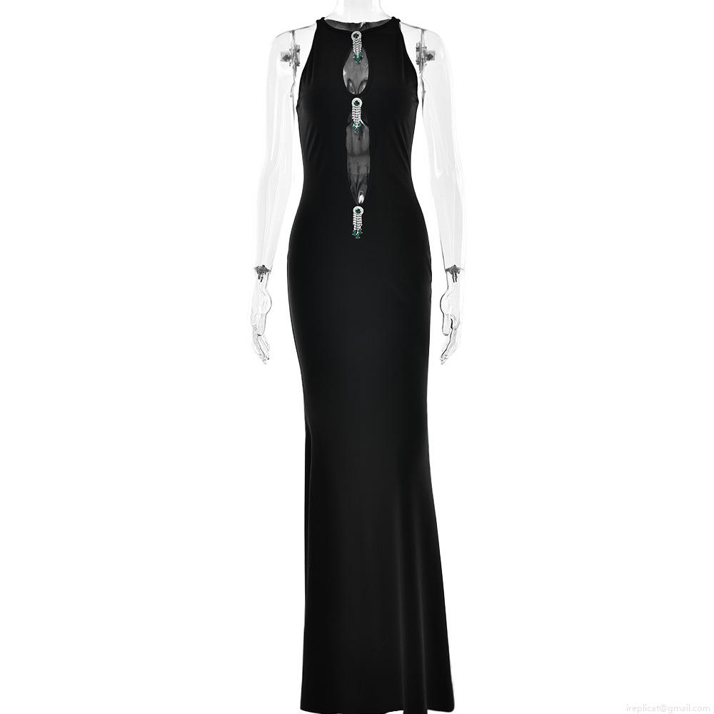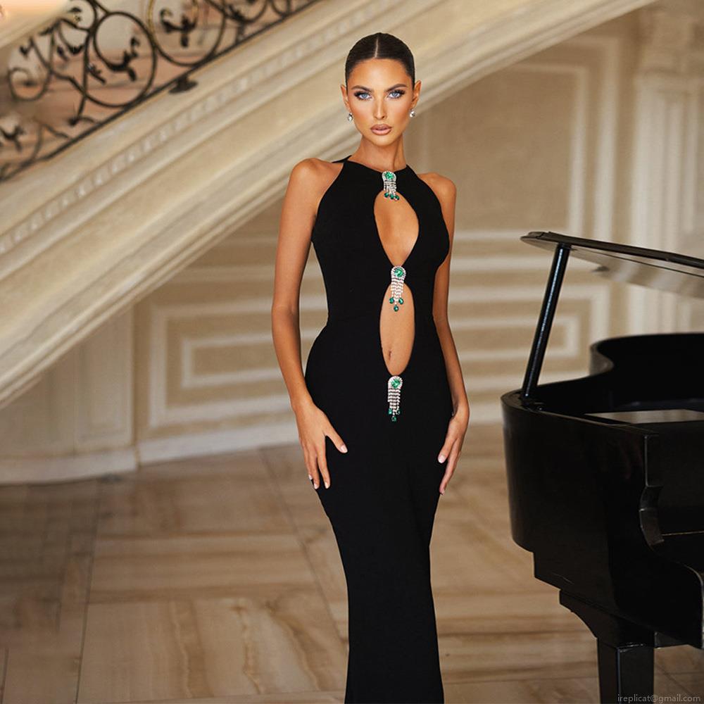 Women's Elegant Hollow Out Halter Maxi Dress With Detachable Green Jewelry Ornaments Slim Fit Mermaid Evening Party Long Gown