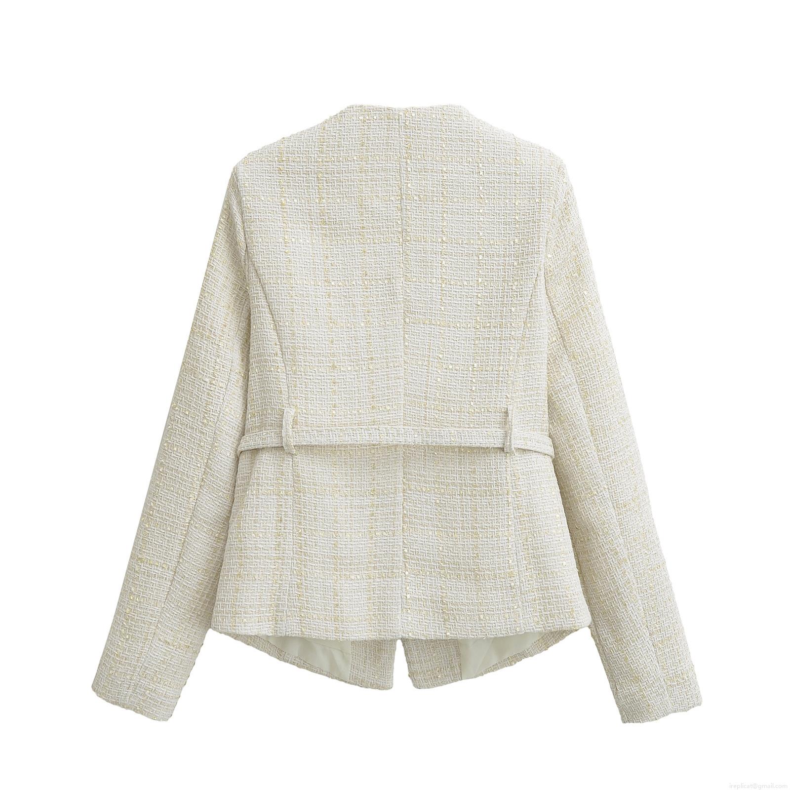 Women's Elegant Ivory Tweed Jacket With Belt Gold Embossed Buttons Round Neck Long Sleeve Classic Cream Short Coat For Office Daily Autumn Winter Outerwear